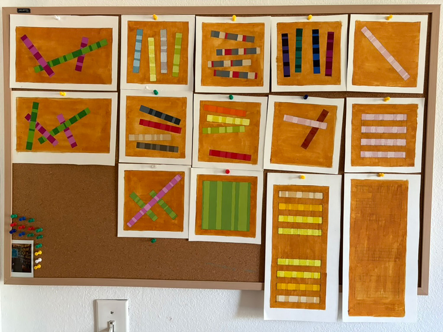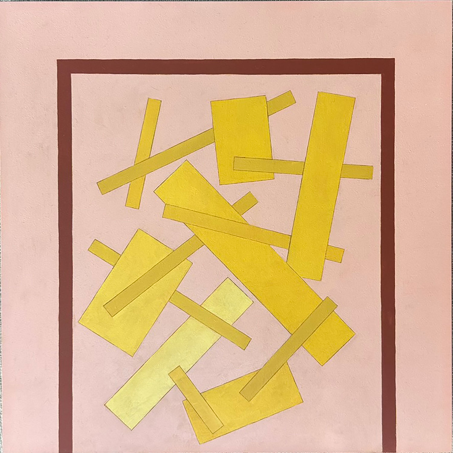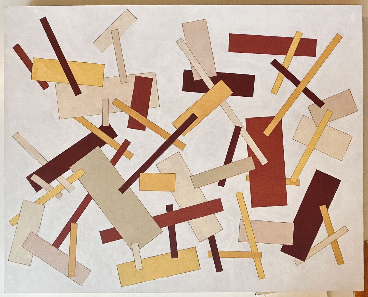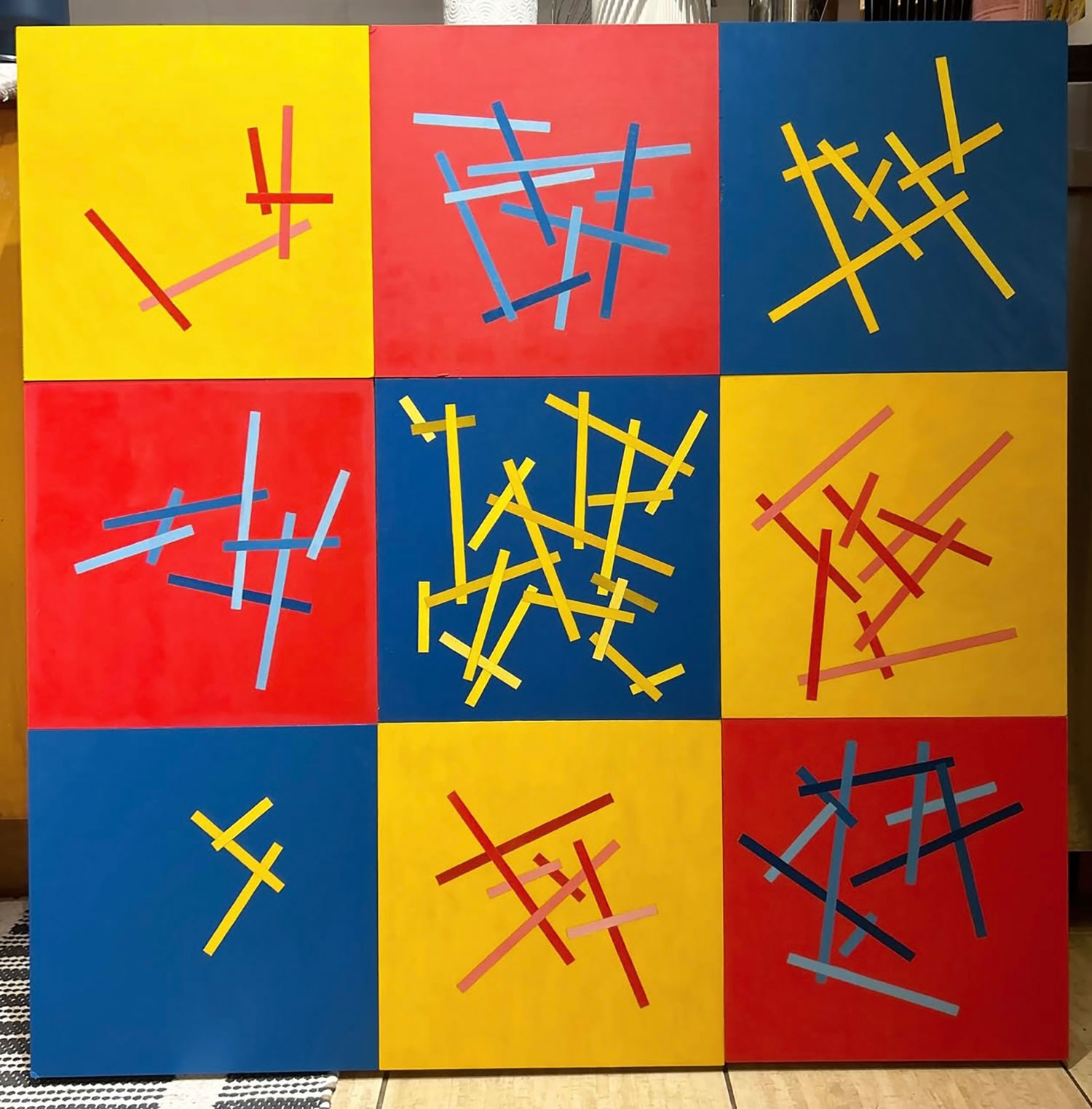 I am a queer, self-taught oil painter whose work is heavily influenced by the Russian avant-garde. I depict elementary forms that dance throughout compositions, adding joy and vivacity to shapes often thought of as austere. The energy and motion of my paintings enlivens rooms, drawing energy throughout spaces.