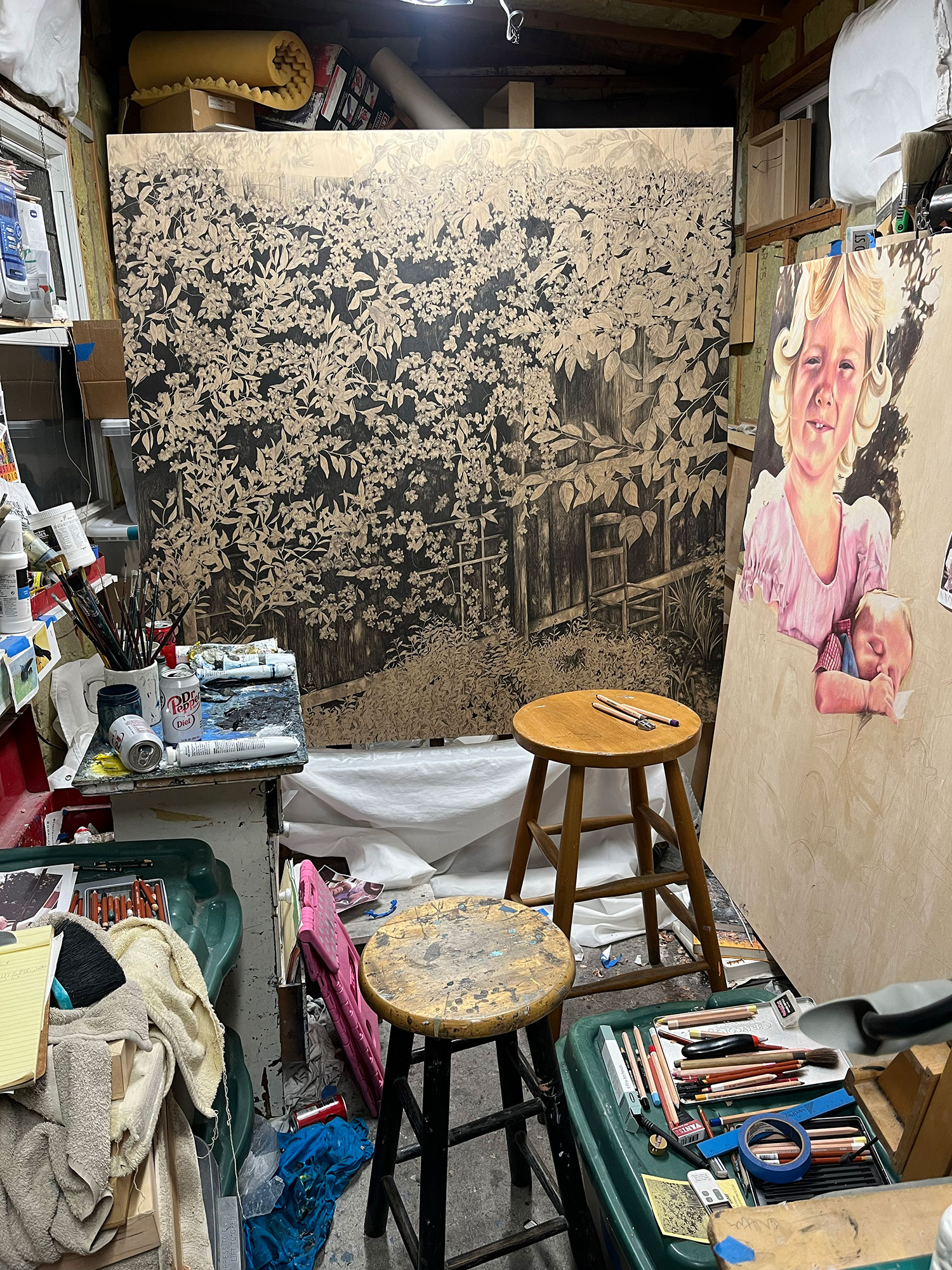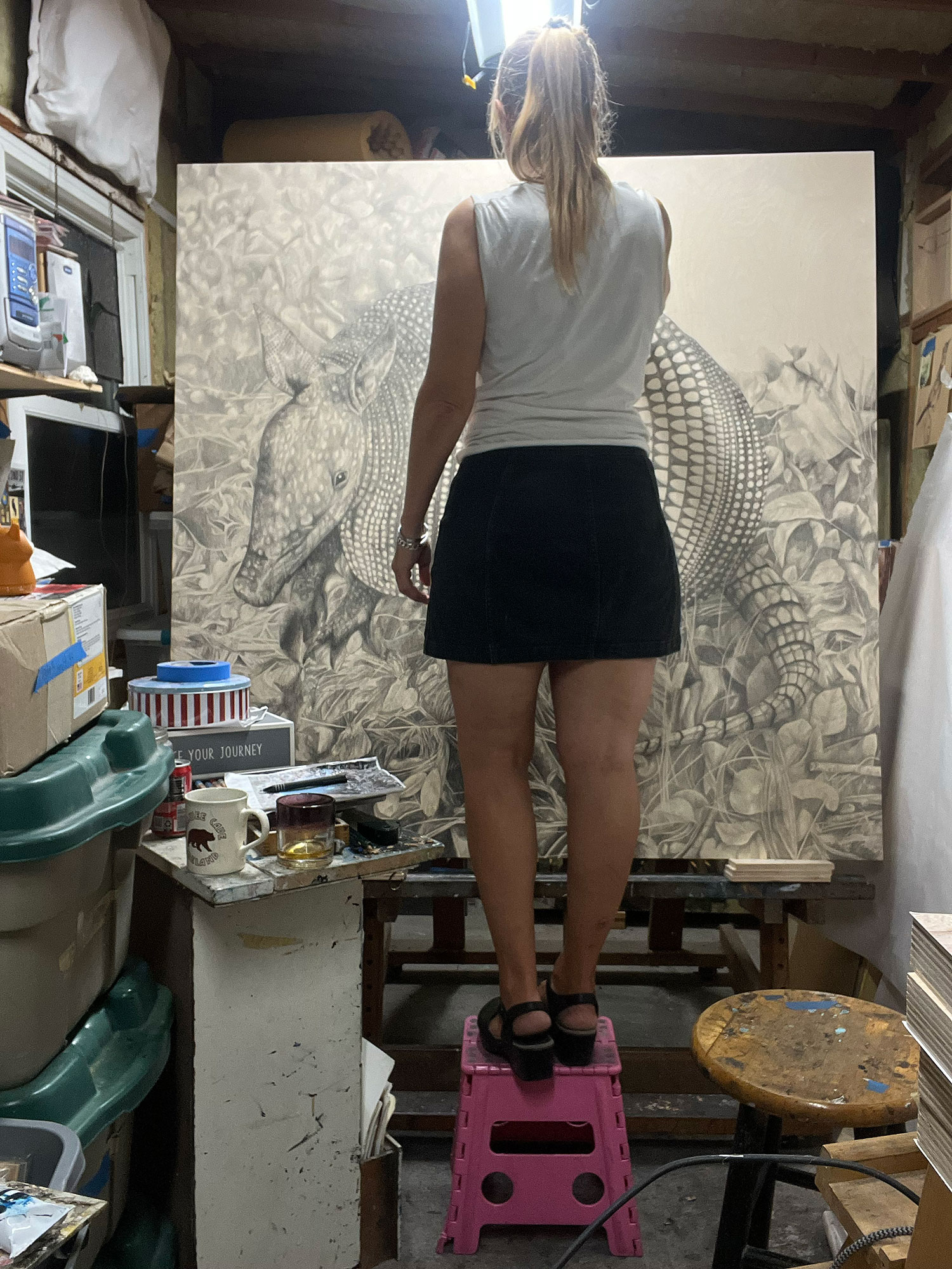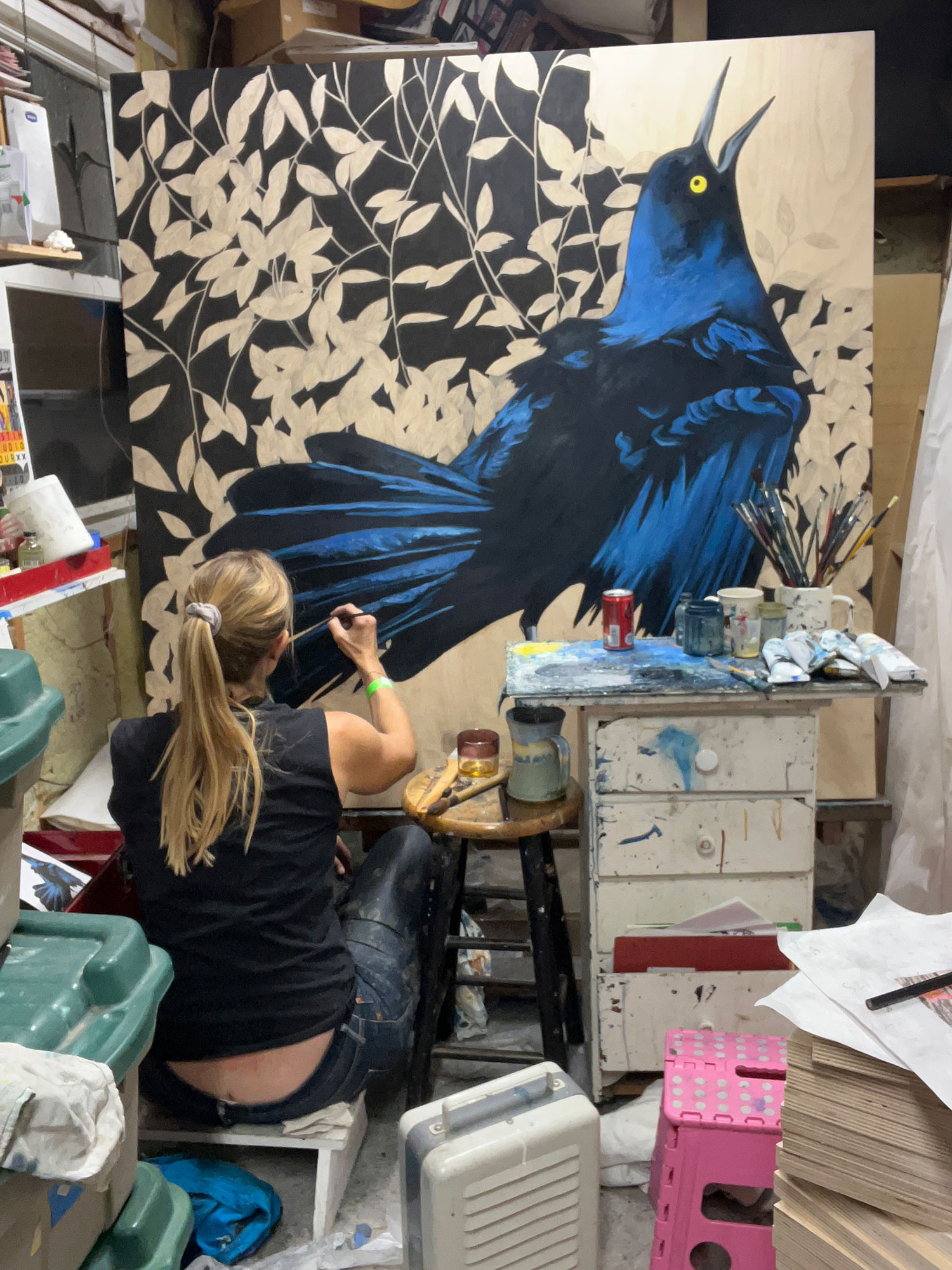 I am a multidisciplinary full time artist, most known for my grackle oil paintings on wood and 2024 Austin Public Library merch design. Recently, I am inspired by memories and sentimental experiences and create large drawings, textural mixed media panels and plaster cast sculpture. I received a BFA in painting from James Madison University. I have worked in my backyard studio since 2006 at my home, Grackle House, with my daughter, 5 silkie chickens, a rabbit, a dog and two fish.
