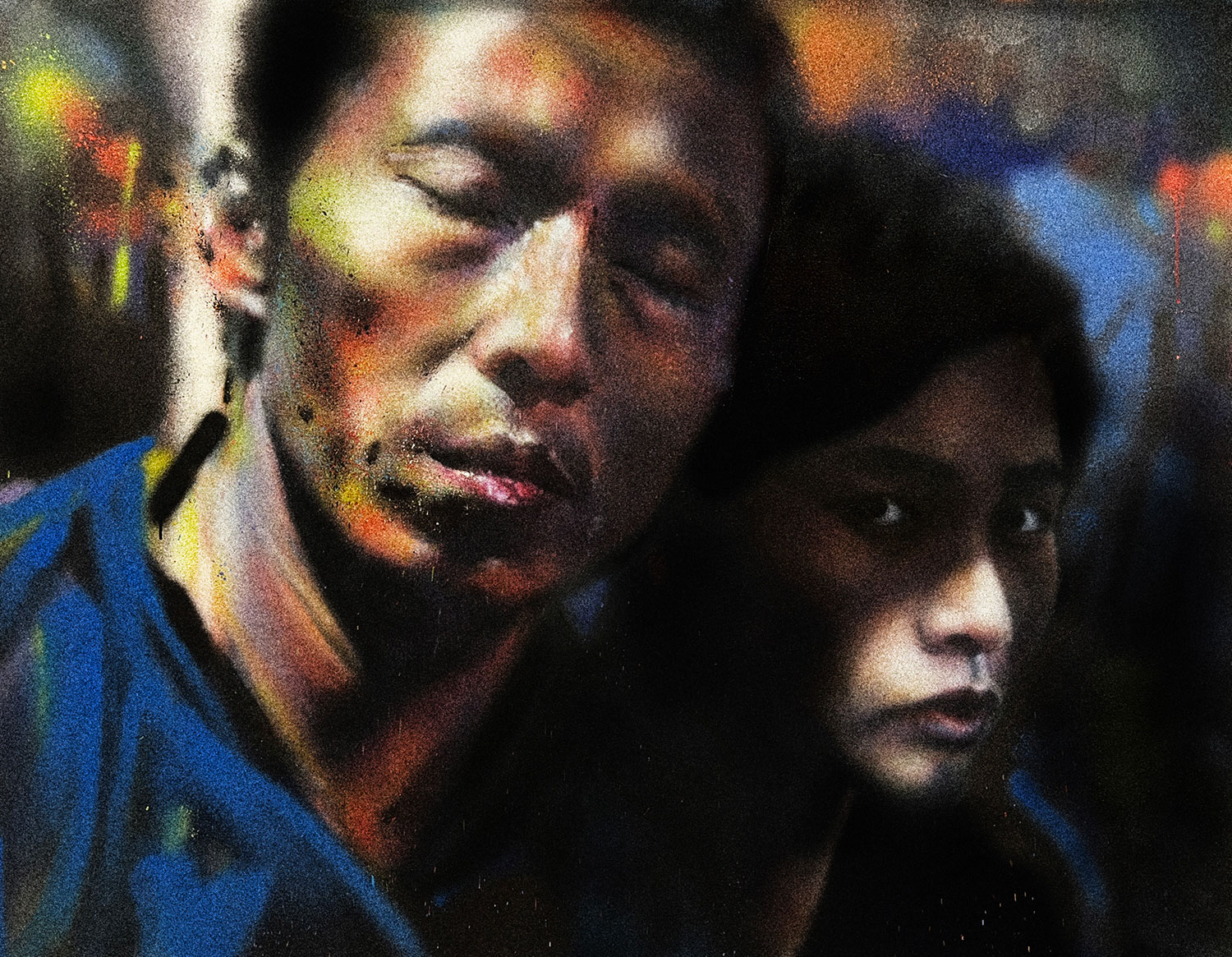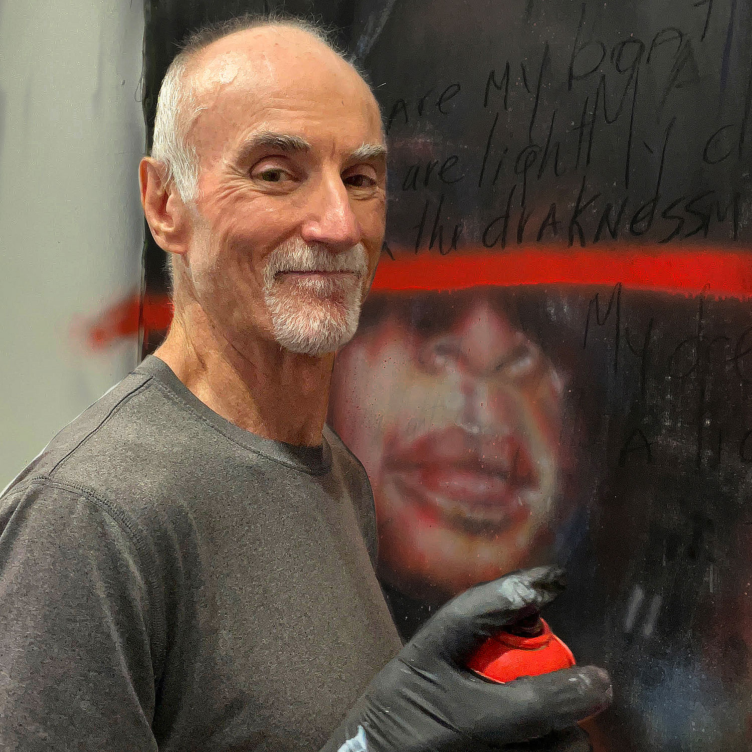 Iβm a painter working with spray paints, oil sticks and charcoal on canvas, ranging up to 7×10 ft. My subject is people shaped by the stress and demands of modern life, and through an exploration of surface, light and shadow, color and line. Spray paint gives me the speed and spontaneity of drawing along with all the tonal possibilities of paint. Iβm in my studio most of the day, most of the week.