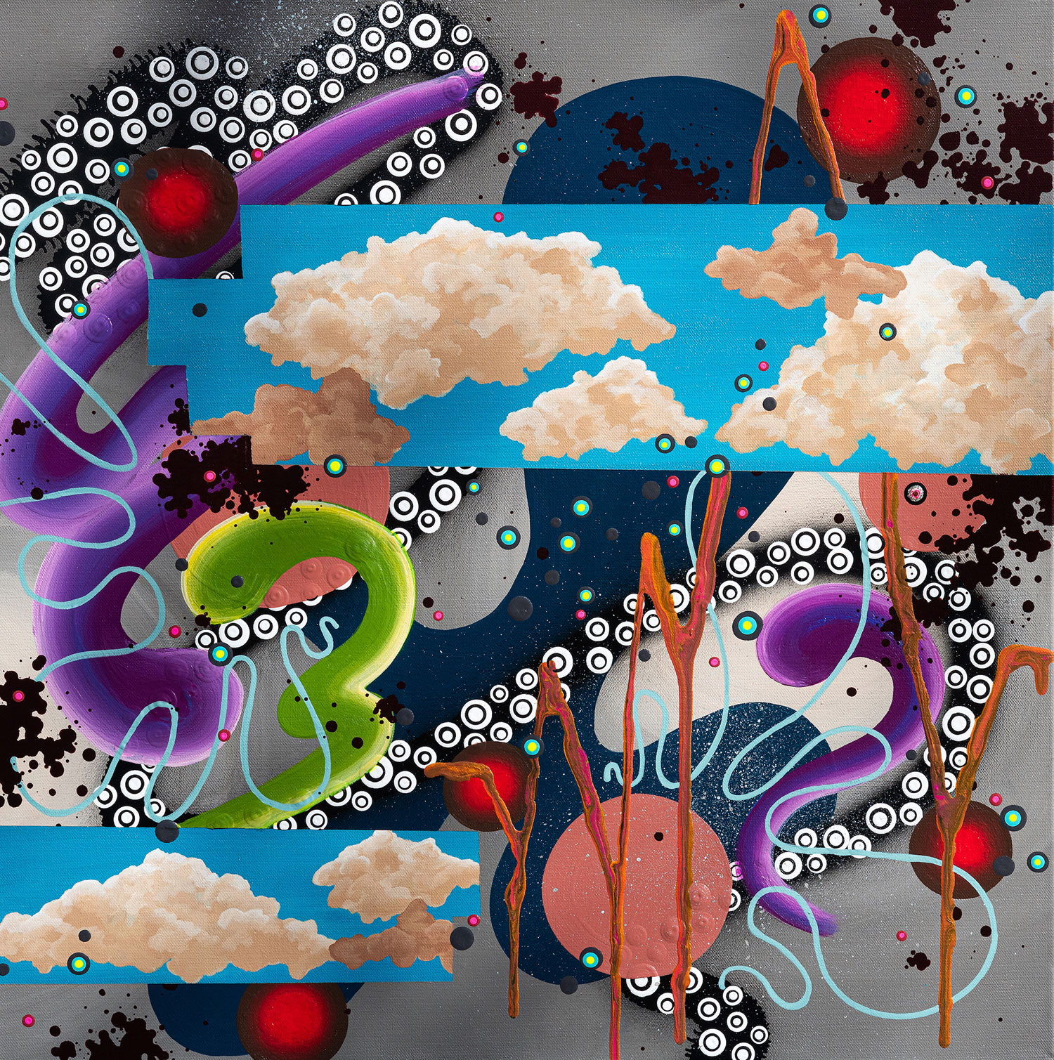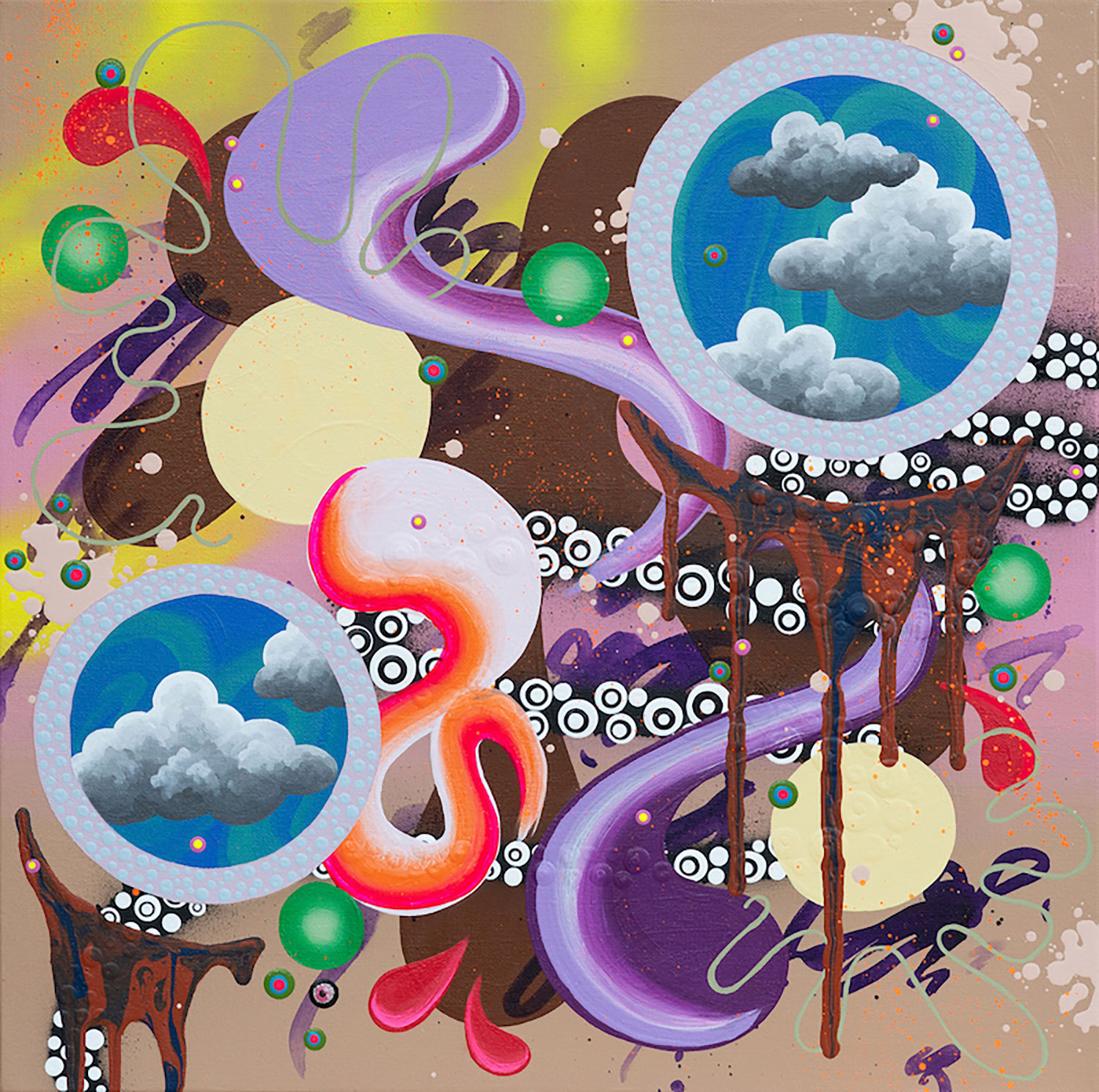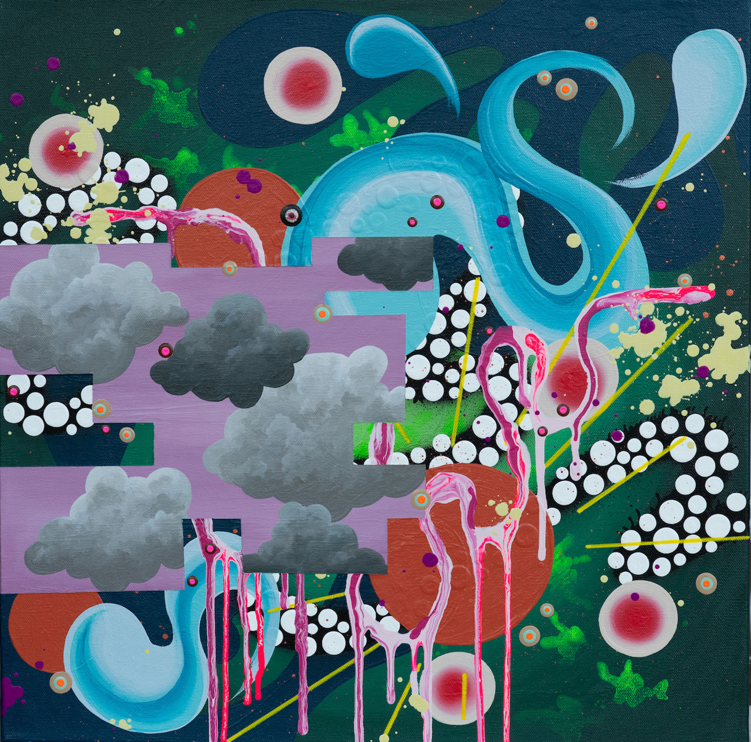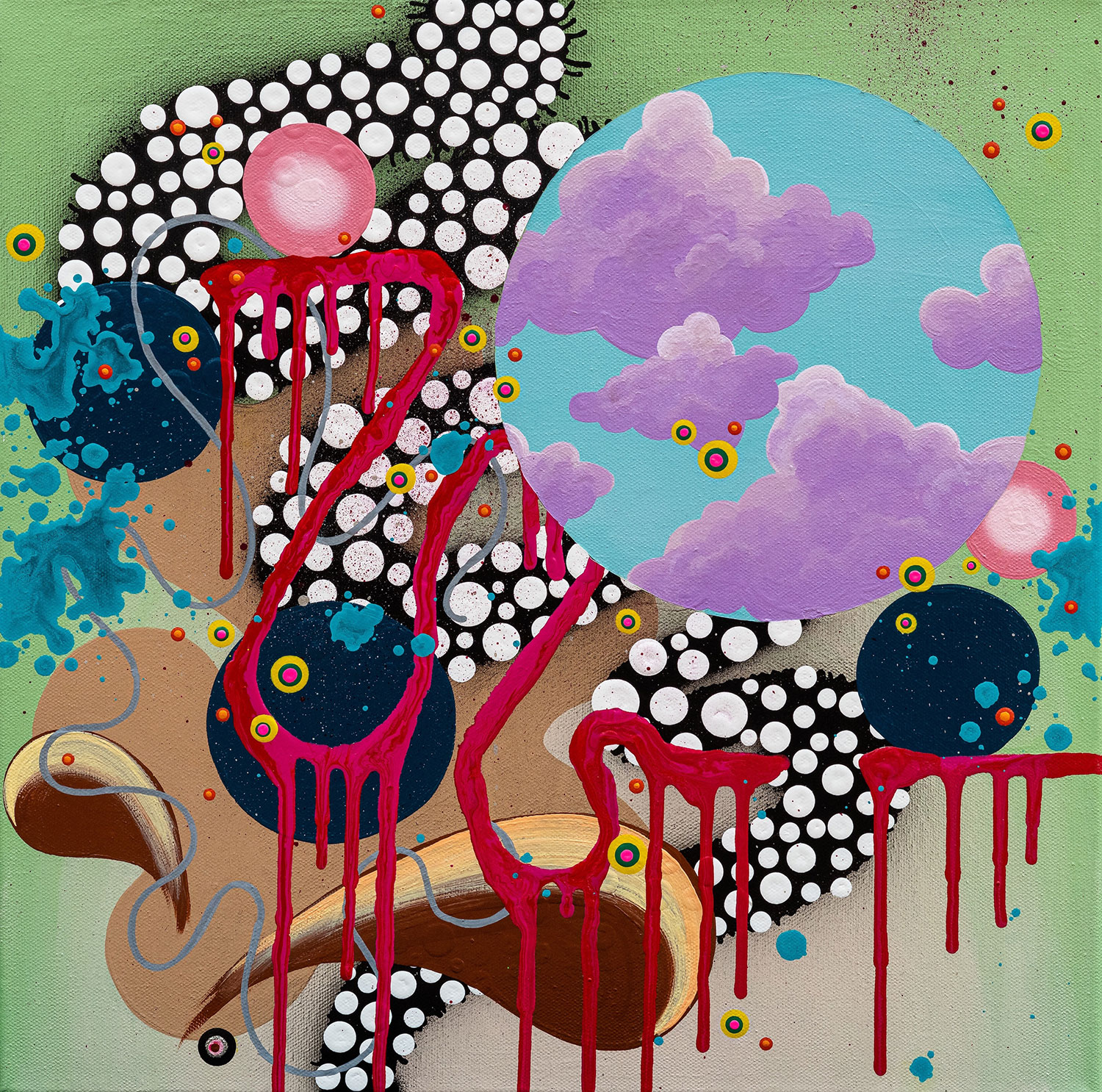 I work predominantly with acrylic based paint and glitter on canvas. I contribute my take on themes regarding mental health and my ever changing reality through my ongoing practice. I create dreamscapes of my inner world—storytelling my personal lore on the way to a deeper understanding of self.