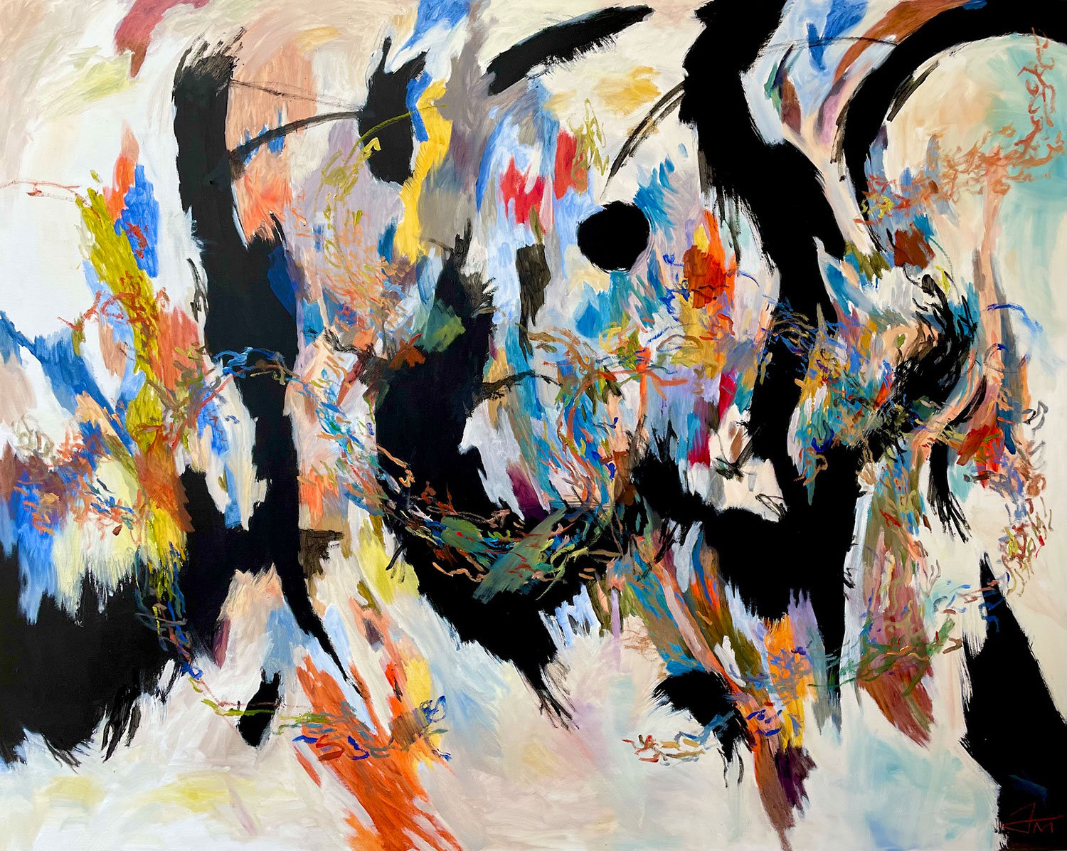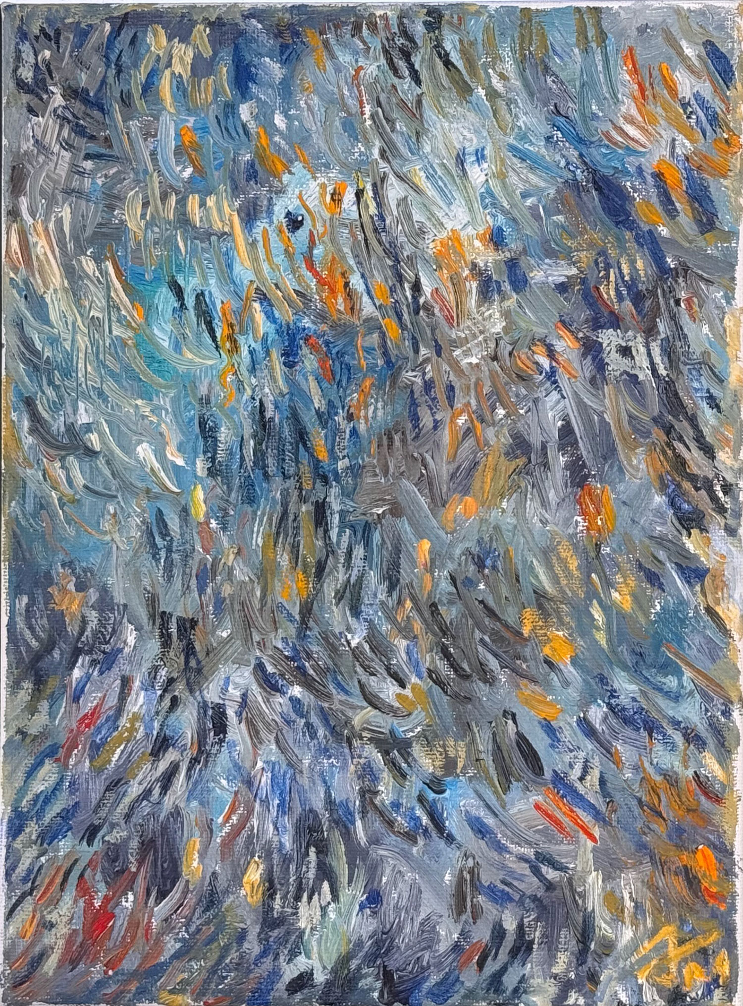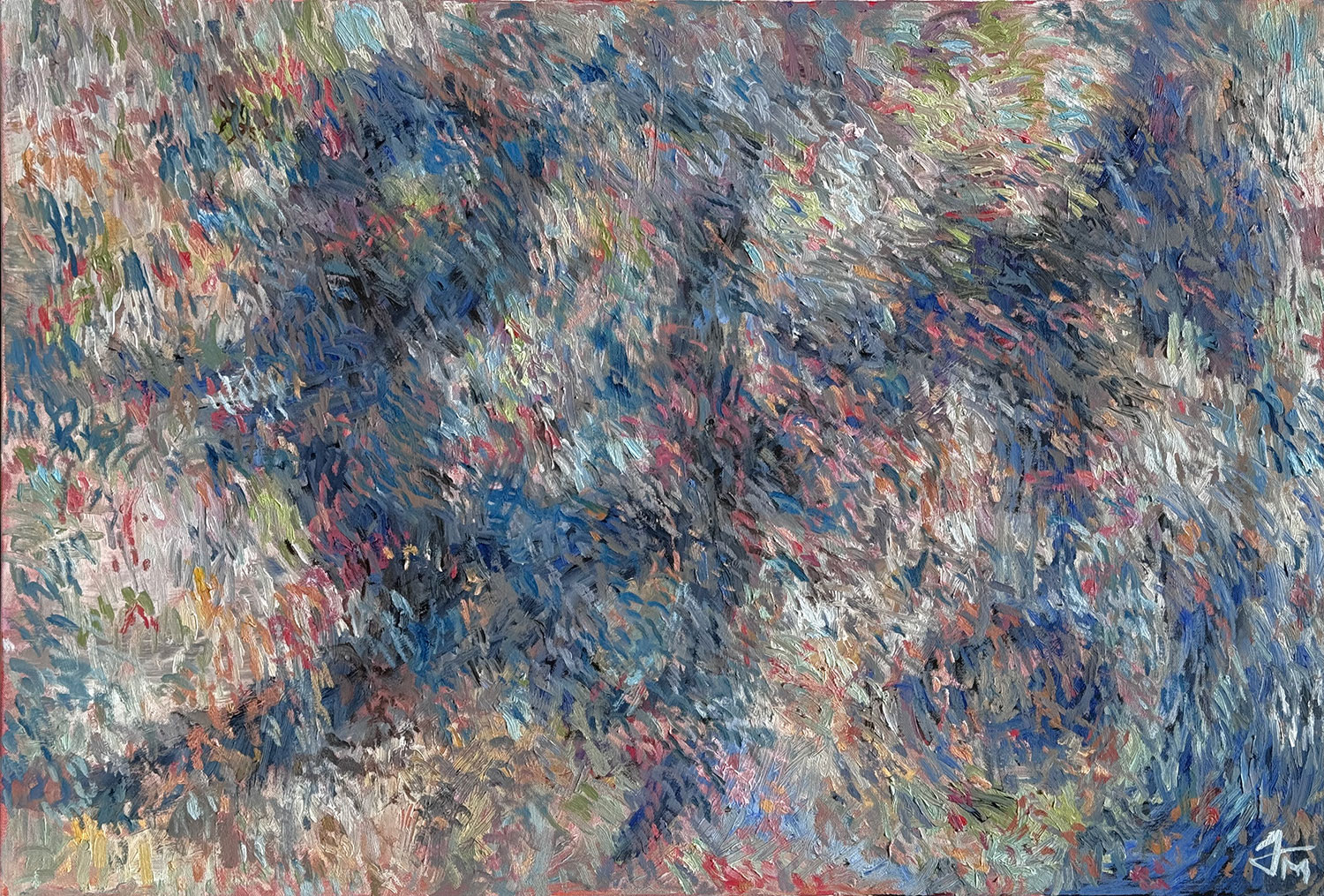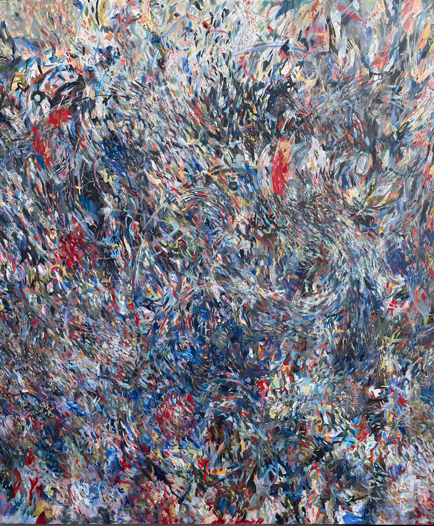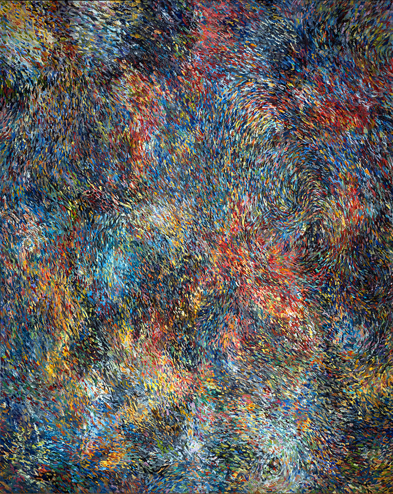 Countless strokes overlap, collide and scatter in shifting waves of color, forming a dense and vibrant field of energy that seems alive and in constant motion, drawn from the elemental forces of nature, including storms, flowing water, winds and the subtle, intricate patterns of organic growth. I work intuitively with a broad and expressive palette of deep blues and grays, fiery reds, warm golds and lush verdant greens. These abstract landscapes invite the eye to wander endlessly, encouraging viewers to uncover new rhythms, hidden details, and subtle connections with each careful viewing.