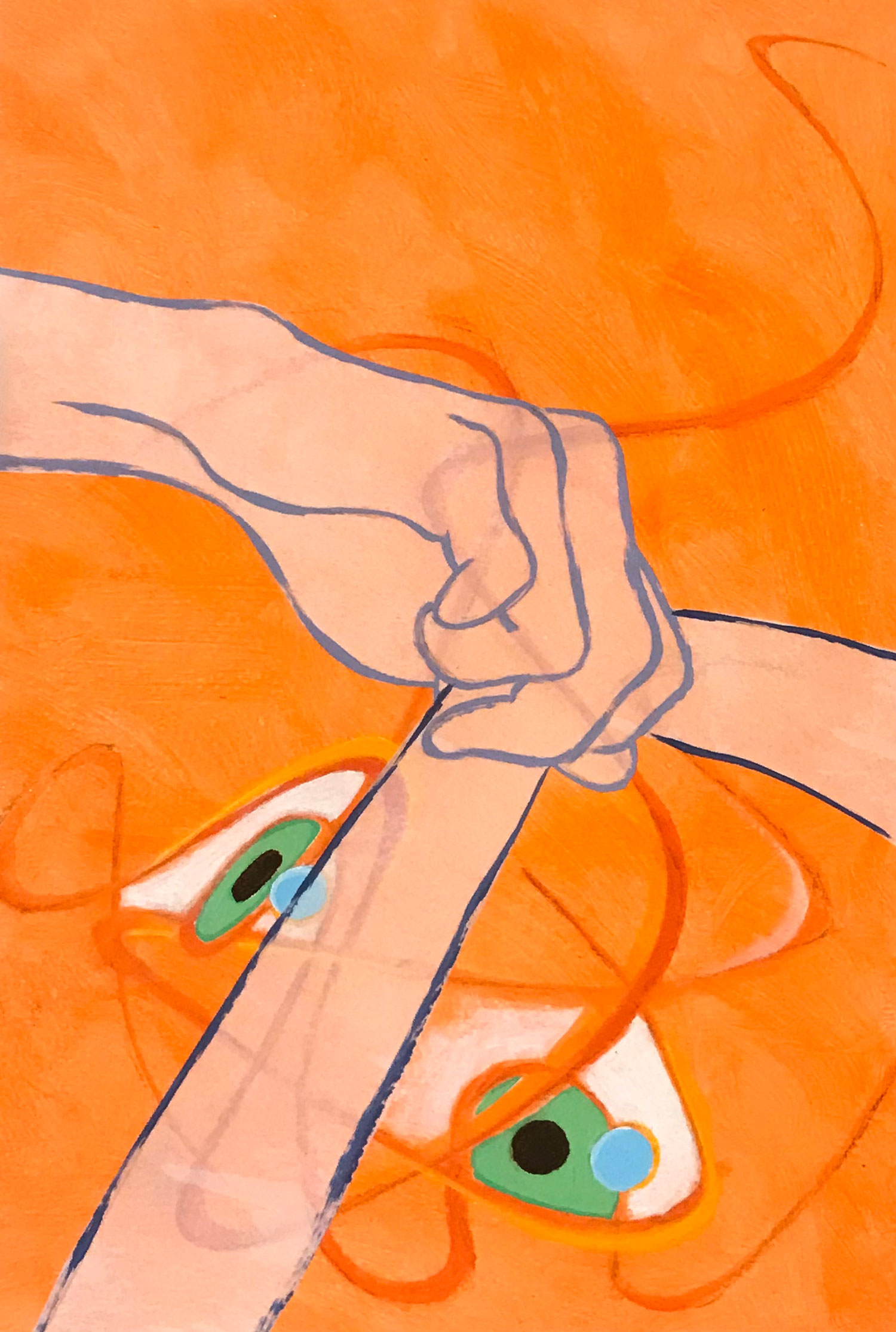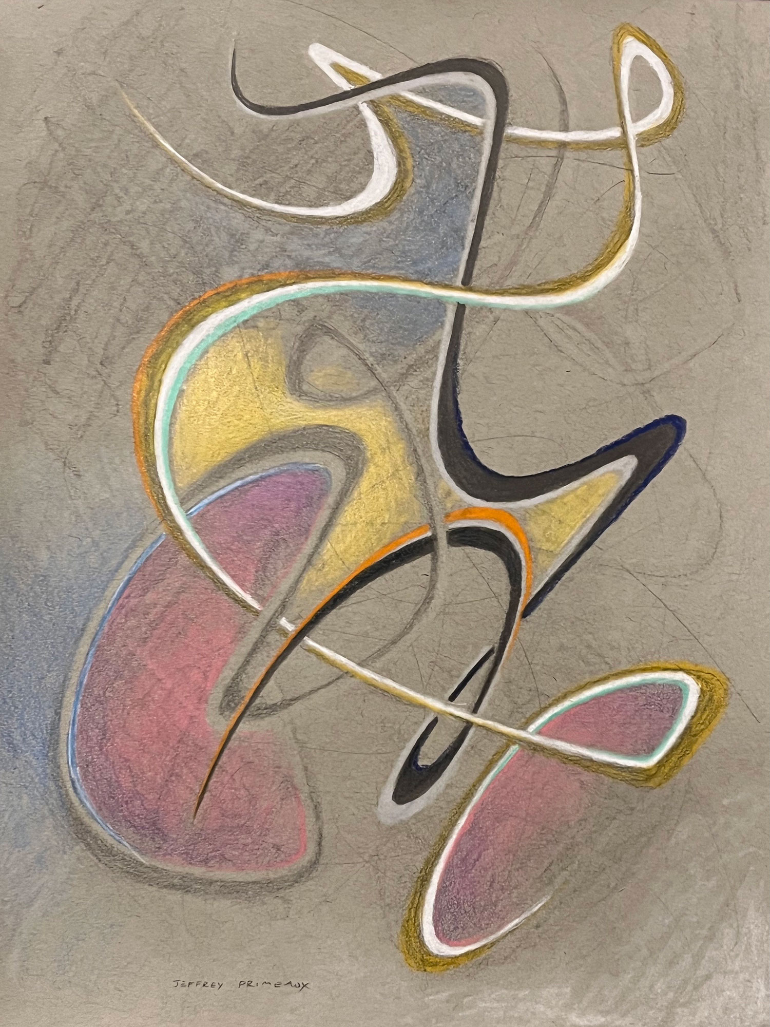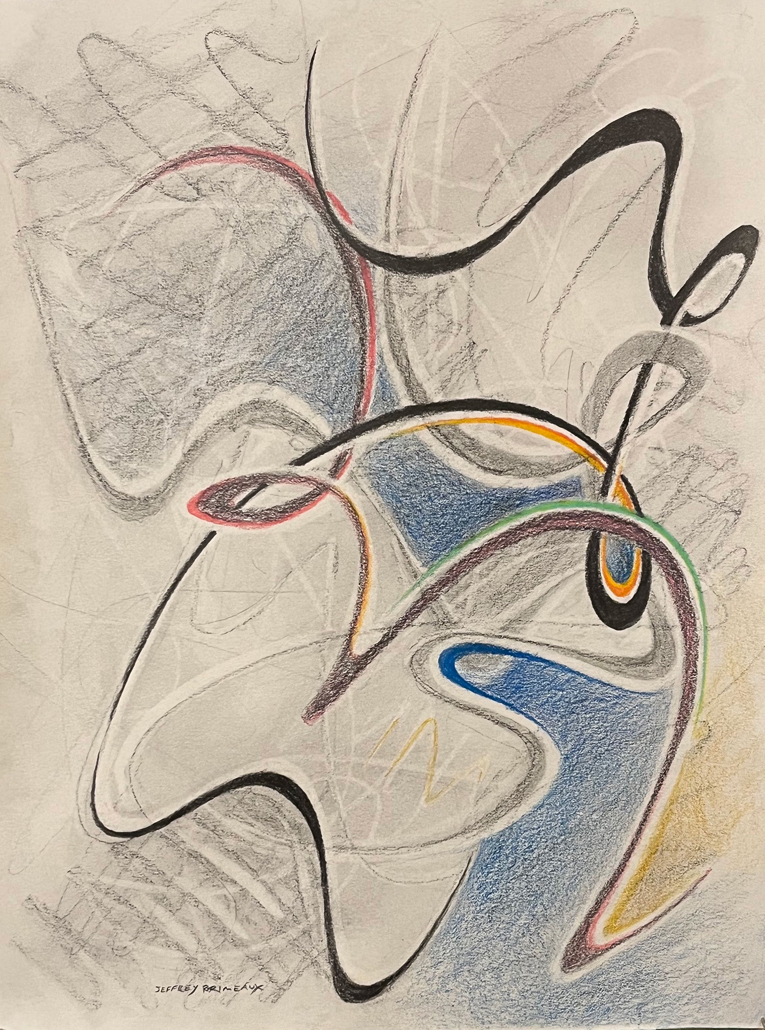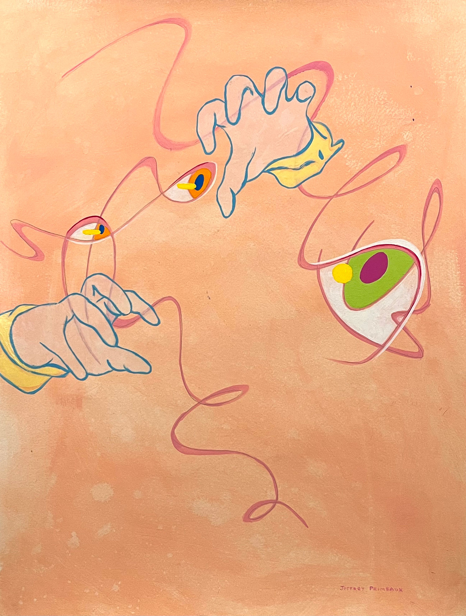 Jeffreyโs abstract work arose, in part, from a fascination with the lines of Ukiyo-e prints and manga illustration. Rather than lines reproduced from drawings to create multiple images, however, the lines of his abstract drawings and paintings are made compositely to create single, unique works. In the recent โEyes and Handsโ series, exact facial anatomy is elided while velum cut outs of hands affixed to the underlying eyes-paintings play with relationships of gesture and expressions.