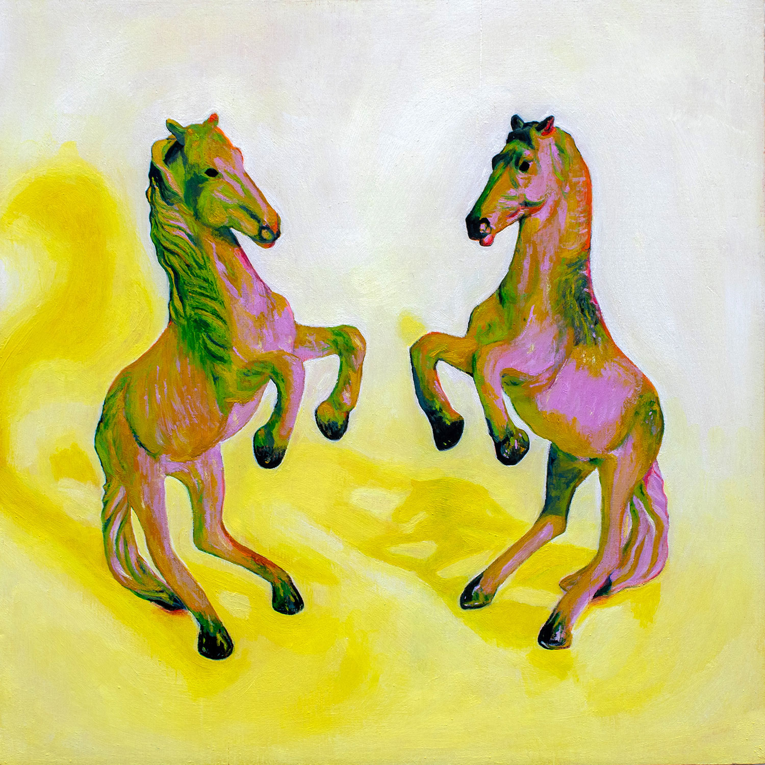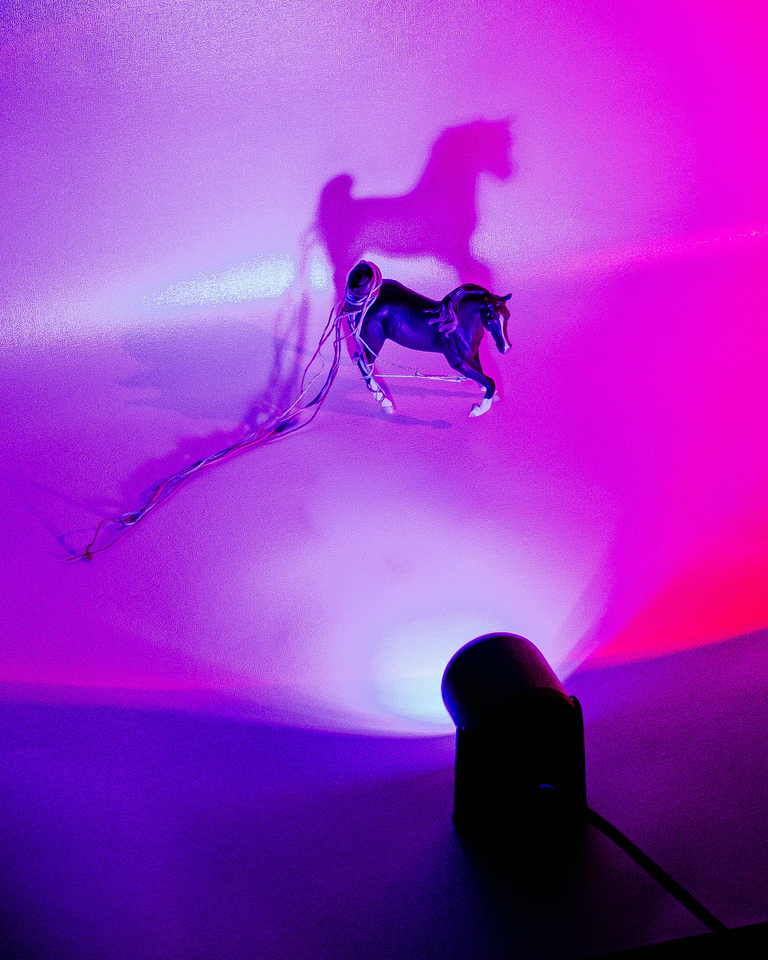 In early adulthood, I experienced an episode of acute manic psychosis, which not only resulted in a Bipolar I diagnosis but turned my world inside out. This event led me to examine perceptions of reality, the balance between freedom and control and the concept of animality. My recent work invites the viewer to project their own understanding of these themes onto prismatic depictions of toy horses and figurines that Iโve collected since childhoodโstaged, embellished and dramatically litโas uncanny, still life tableaus.