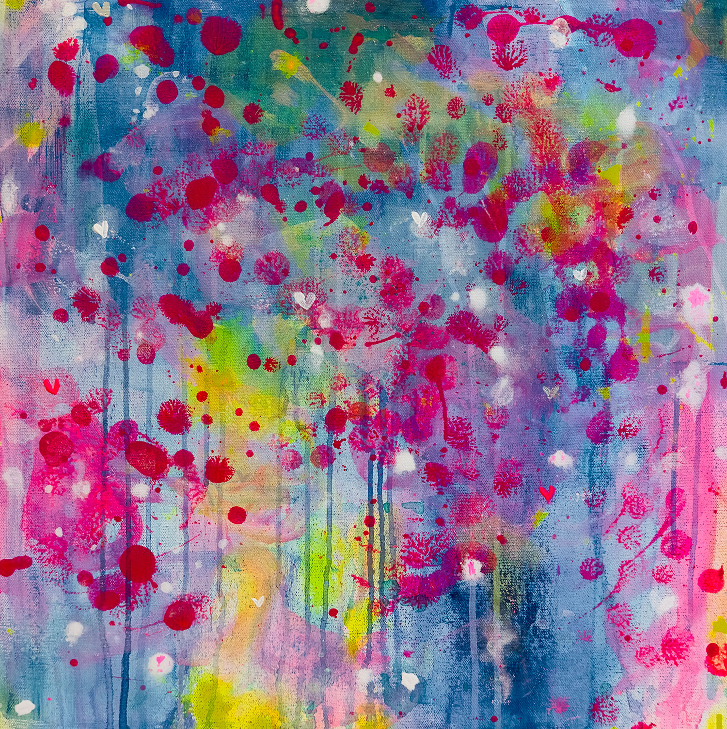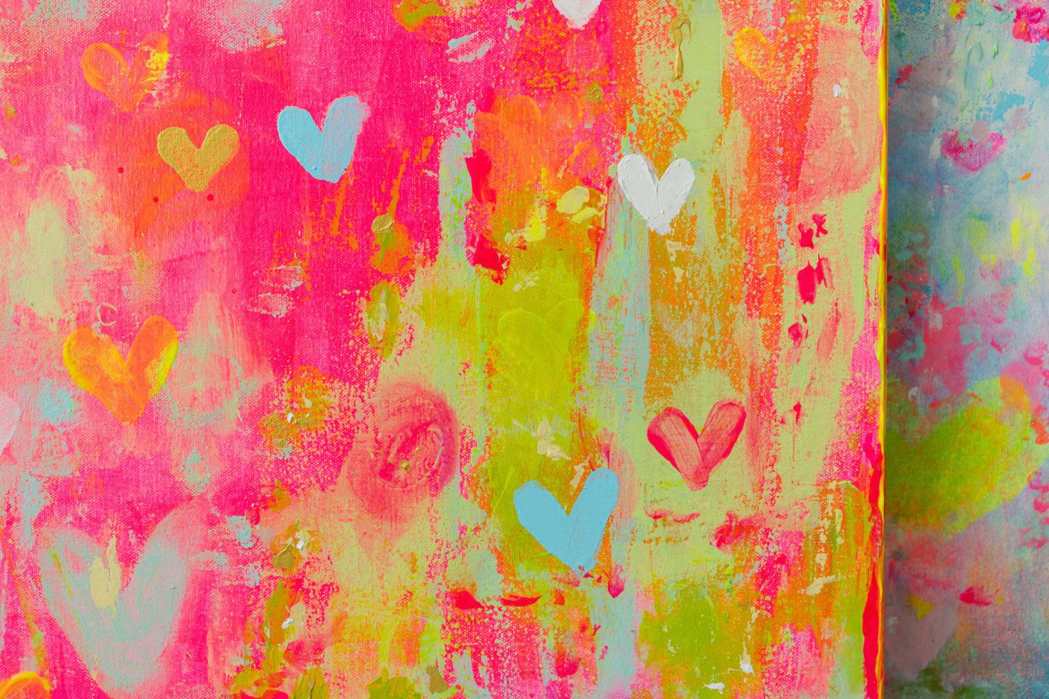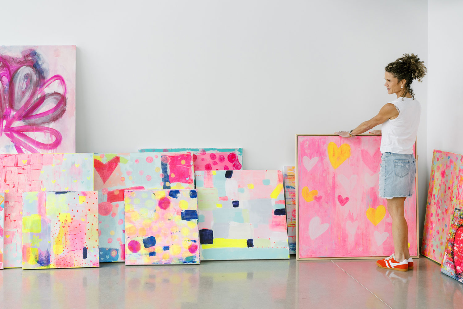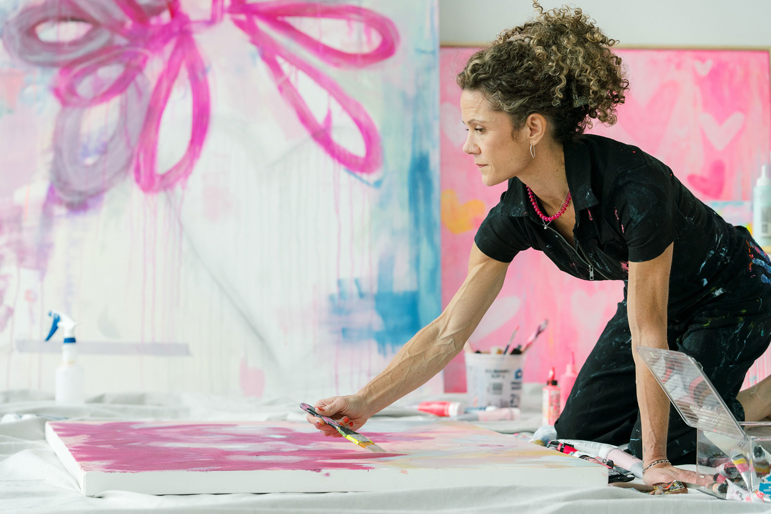 I’m opening up my studio space in Tarrytown, tucked away in the back where the paint really flies. This is where I sling color, chase clarity and lean into the messy middle of being an “accidental artist.” Inside the studio, you’ll find works, medium to large-sized acrylic pieces that command a wall or tuck into the perfect corner. Pink shows up again and again, sparking dopamine and bringing brightness where the world sometimes feels too heavy.