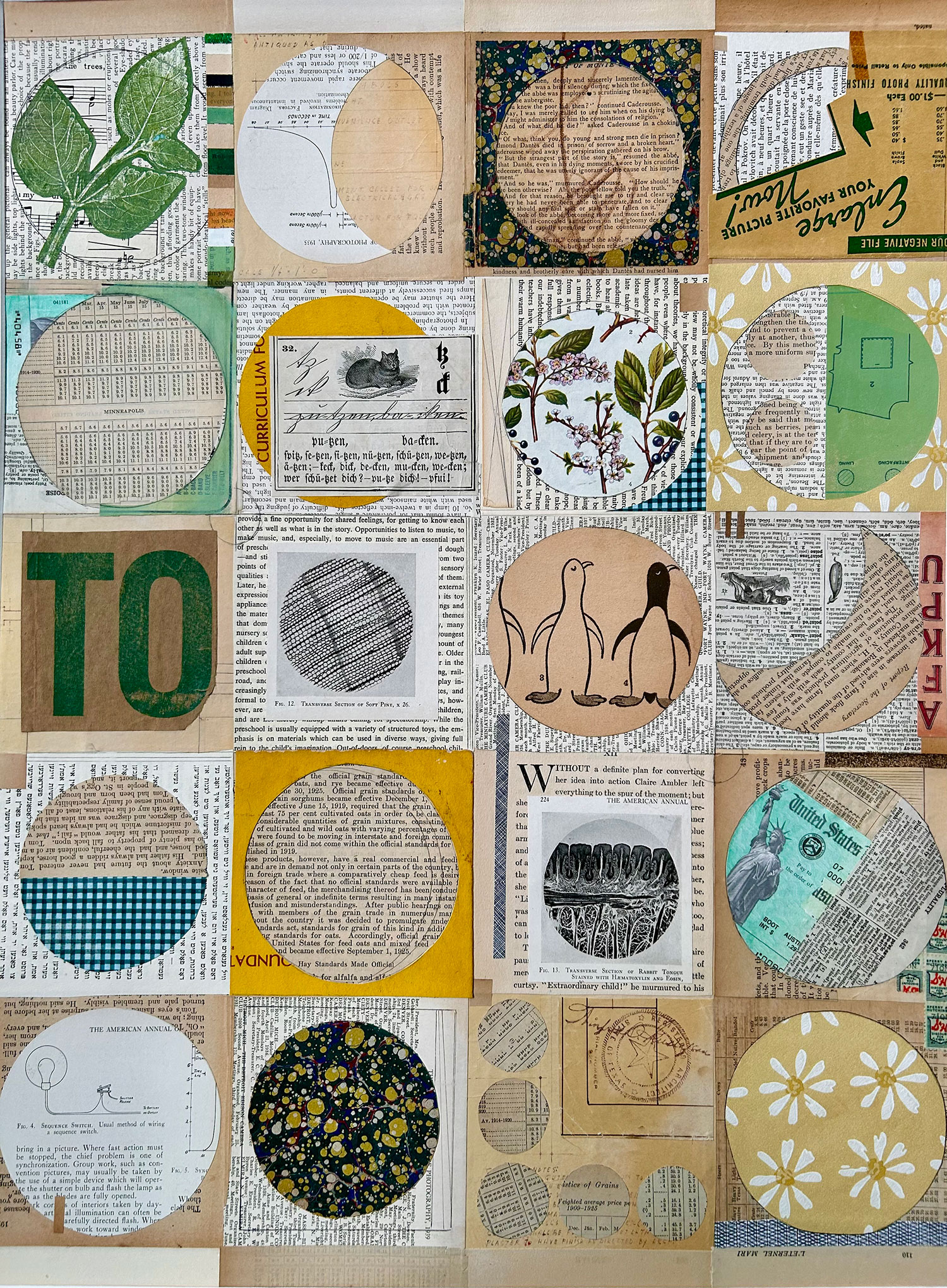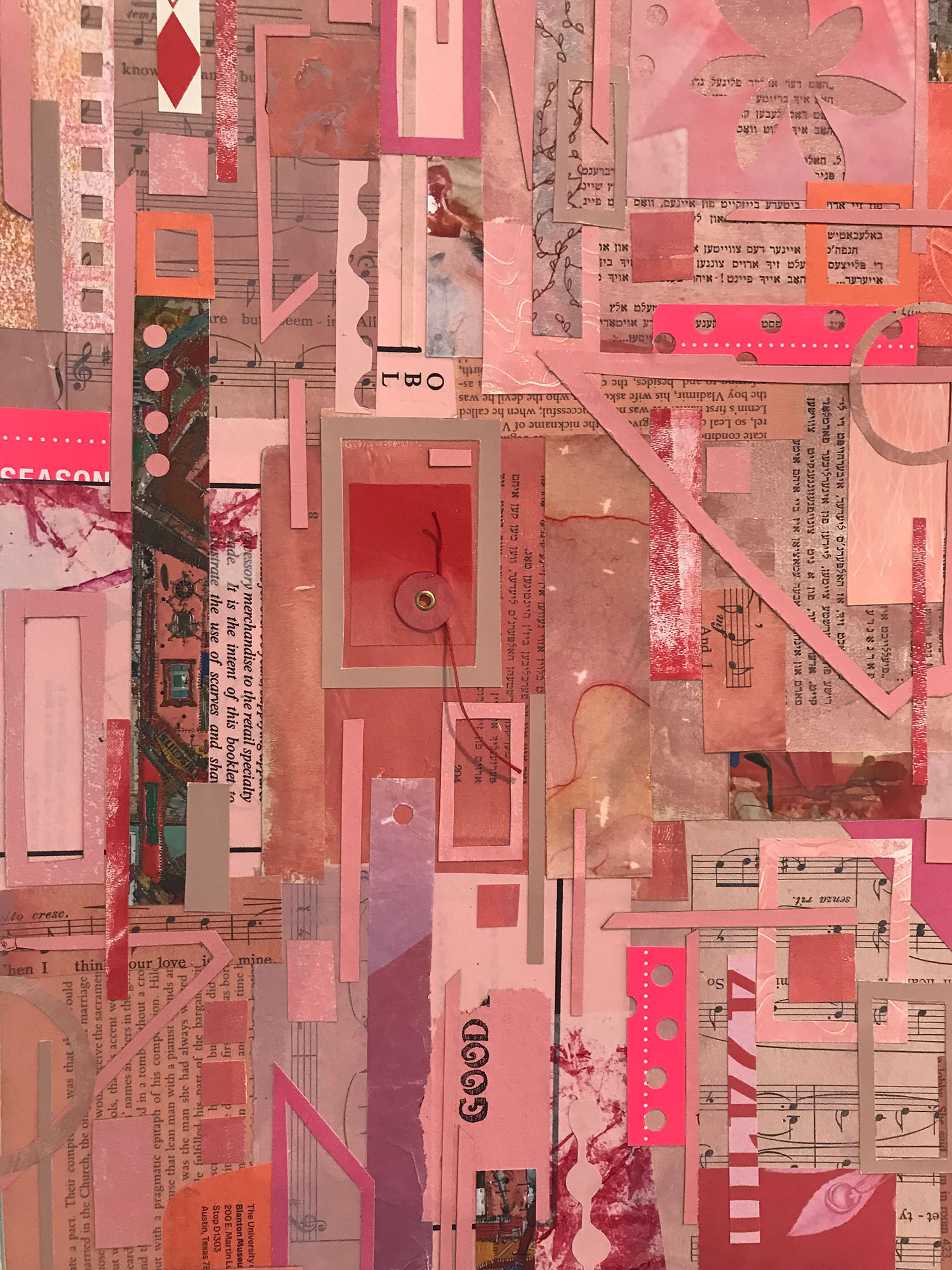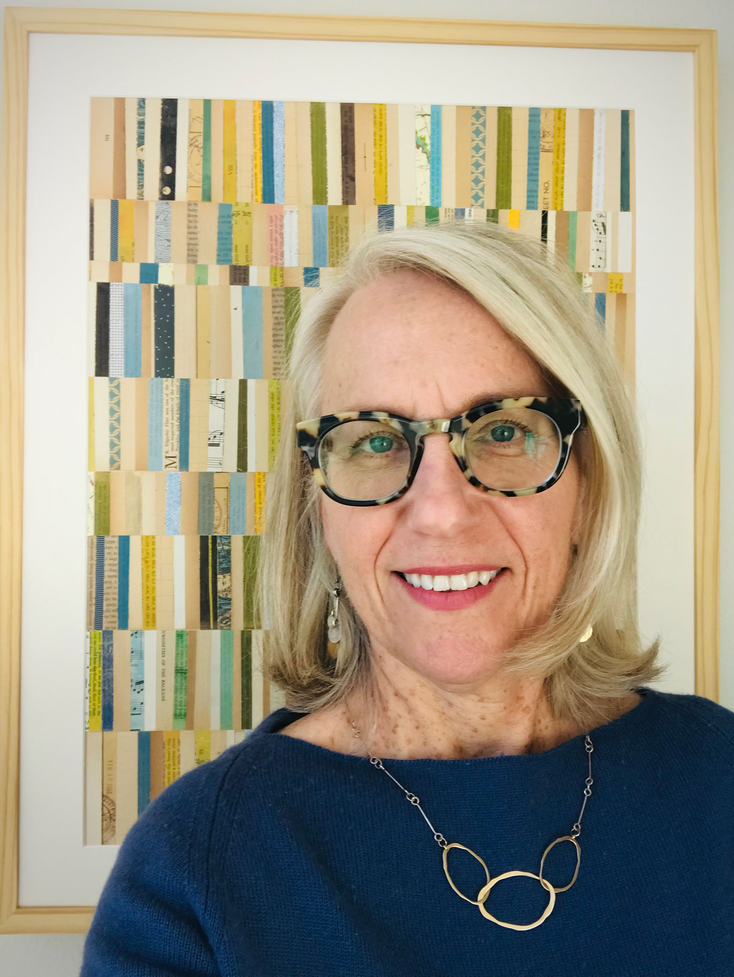 I am a collage artist and longtime Austin resident interested in color, history, memory and the tactile qualities of paper. As Austin speeds headlong into all things new, I find joy in collecting paper that has patina and evokes nostalgia. Though densely layered, my compositions maintain a contemplative calm, like light filtering through a canopy of branches. My work invites the viewer to linger, noticing the interplay of shape, shadow and texture.