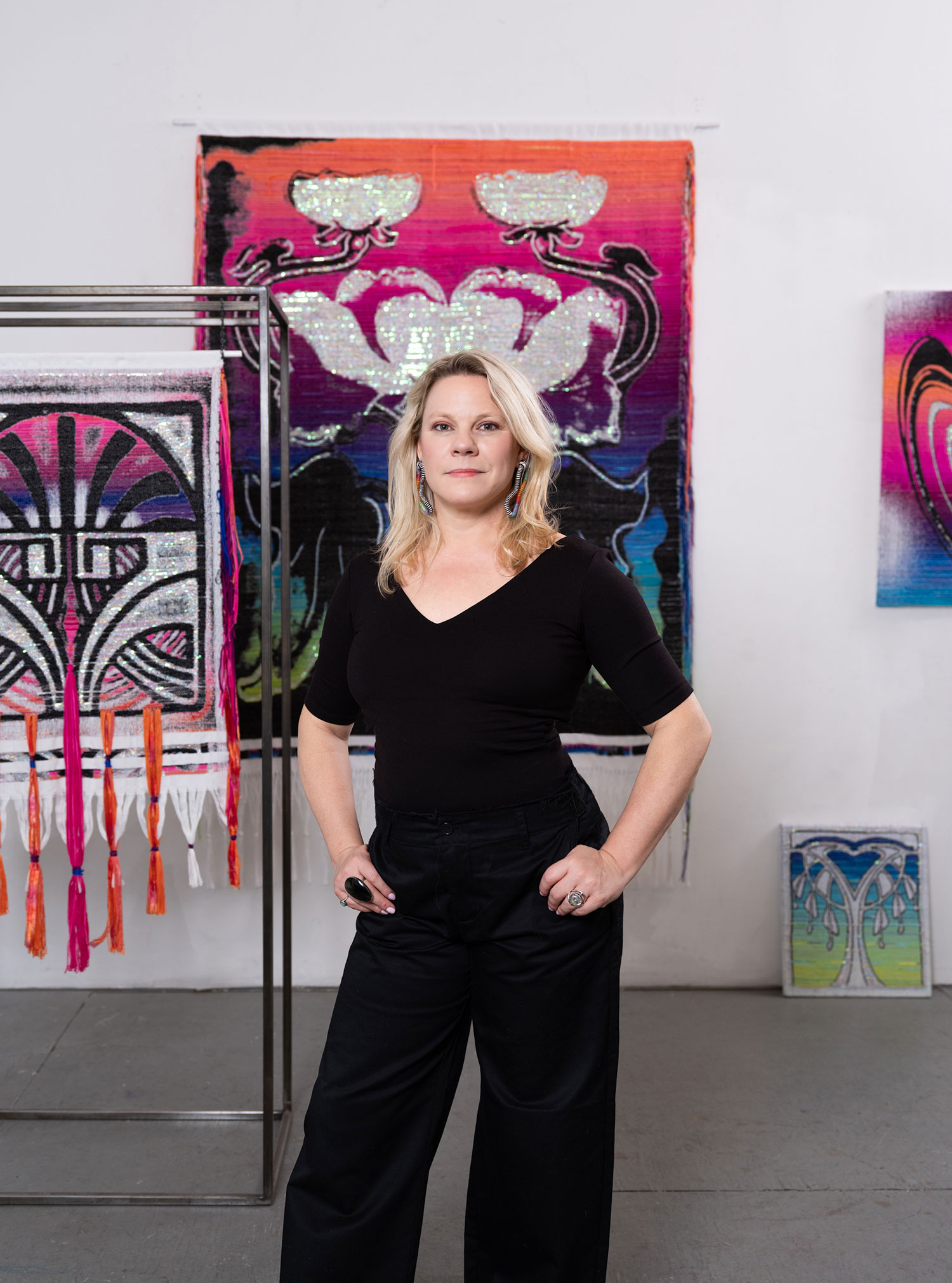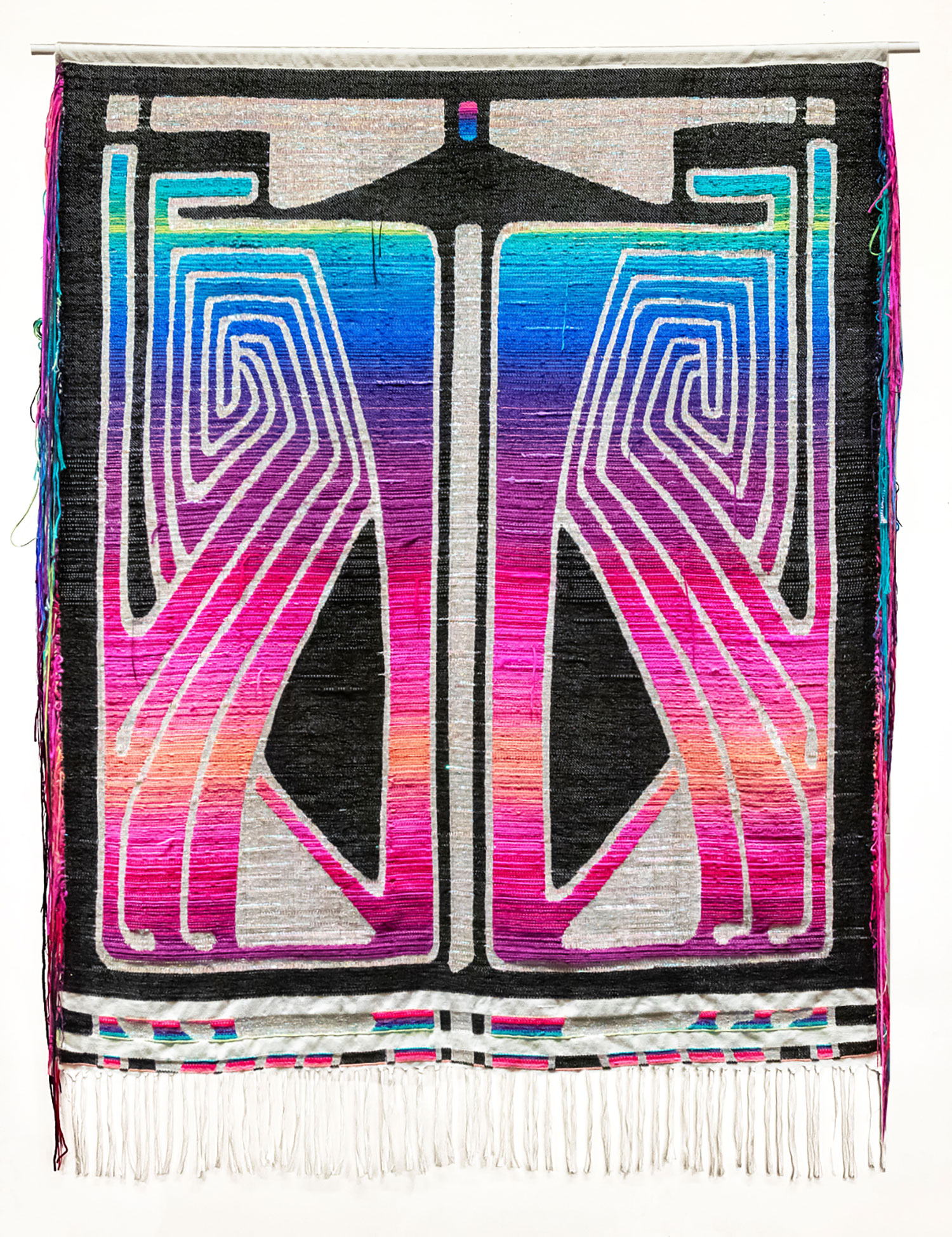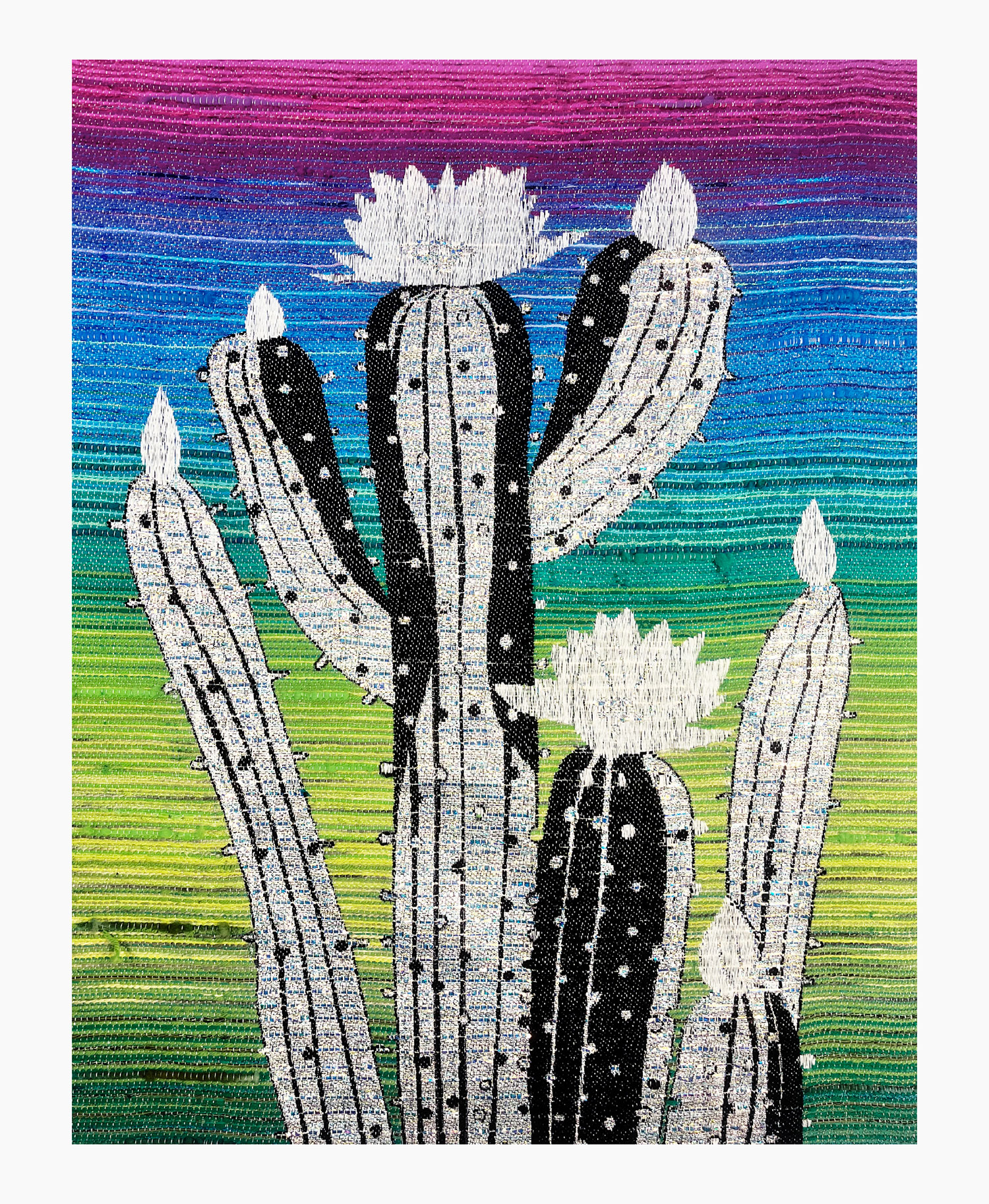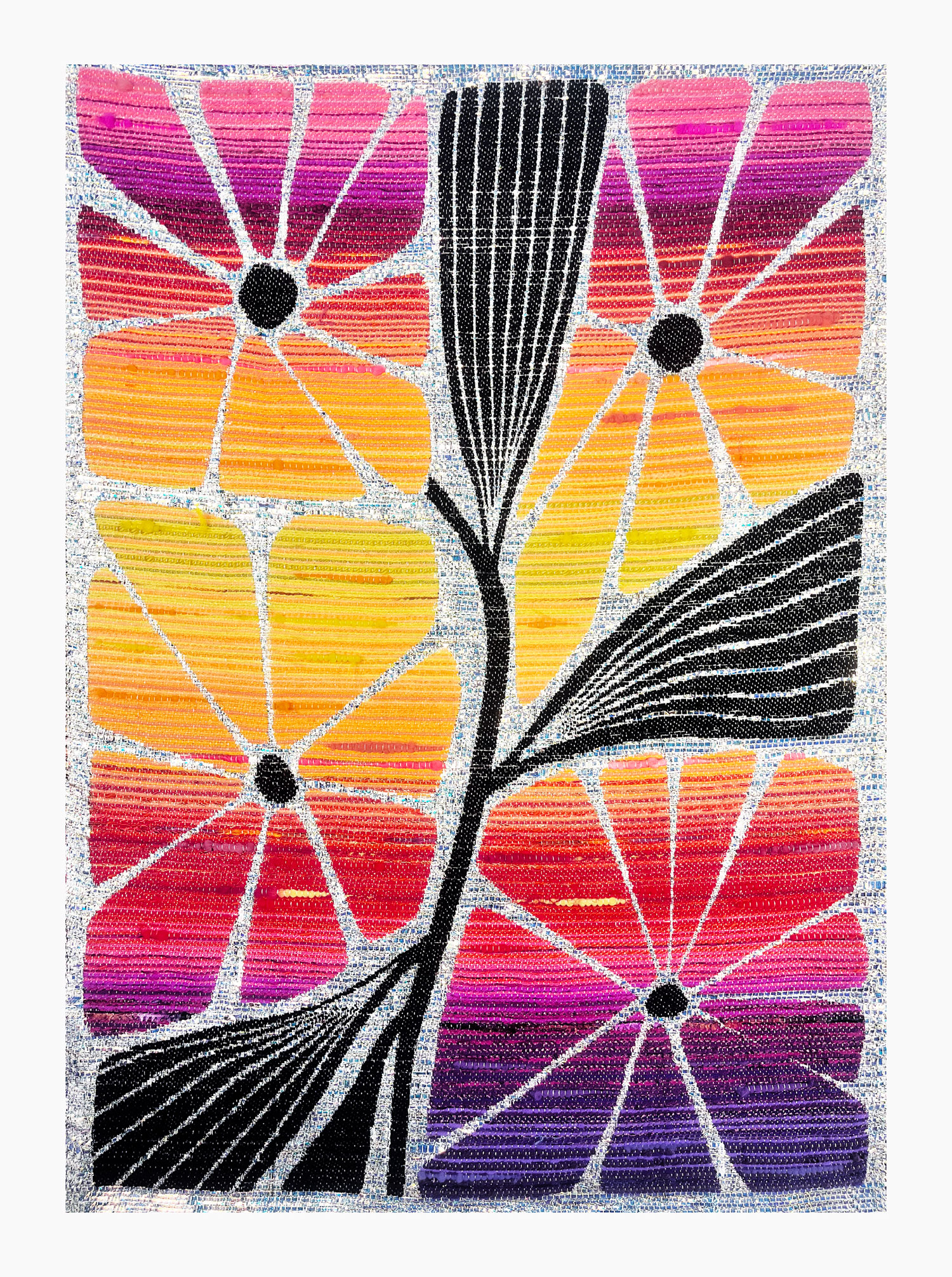 The Light That Grows Here presents new textiles by multidisciplinary artist and weaver Robin Kang, honoring the healing spirit of Texas plants. Rooted in folklore, herbal traditions and digital innovation, her Jacquard-loom weavings merge botanical motifs with motherboard-like designs, exploring ties between nature, technology and spirituality. Using plant-dyed fibers, synthetics and digital sketches, Kang bridges ancestral weaving with contemporary computation, transforming textiles into ritual.