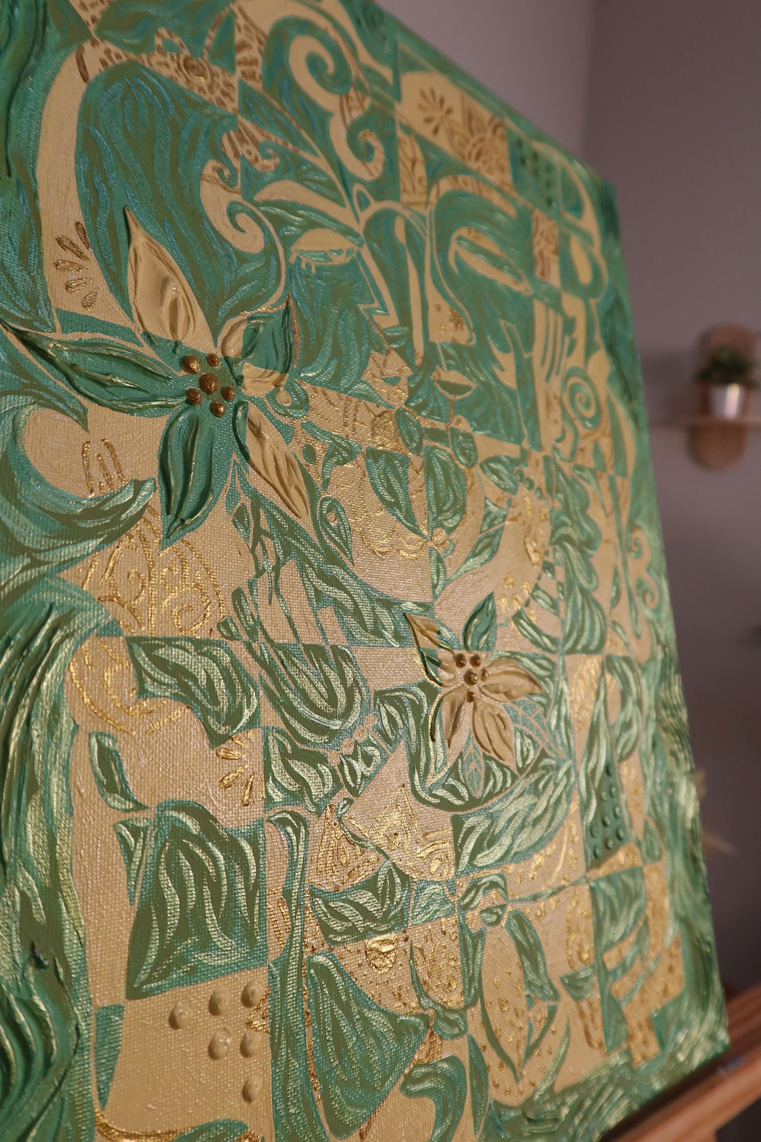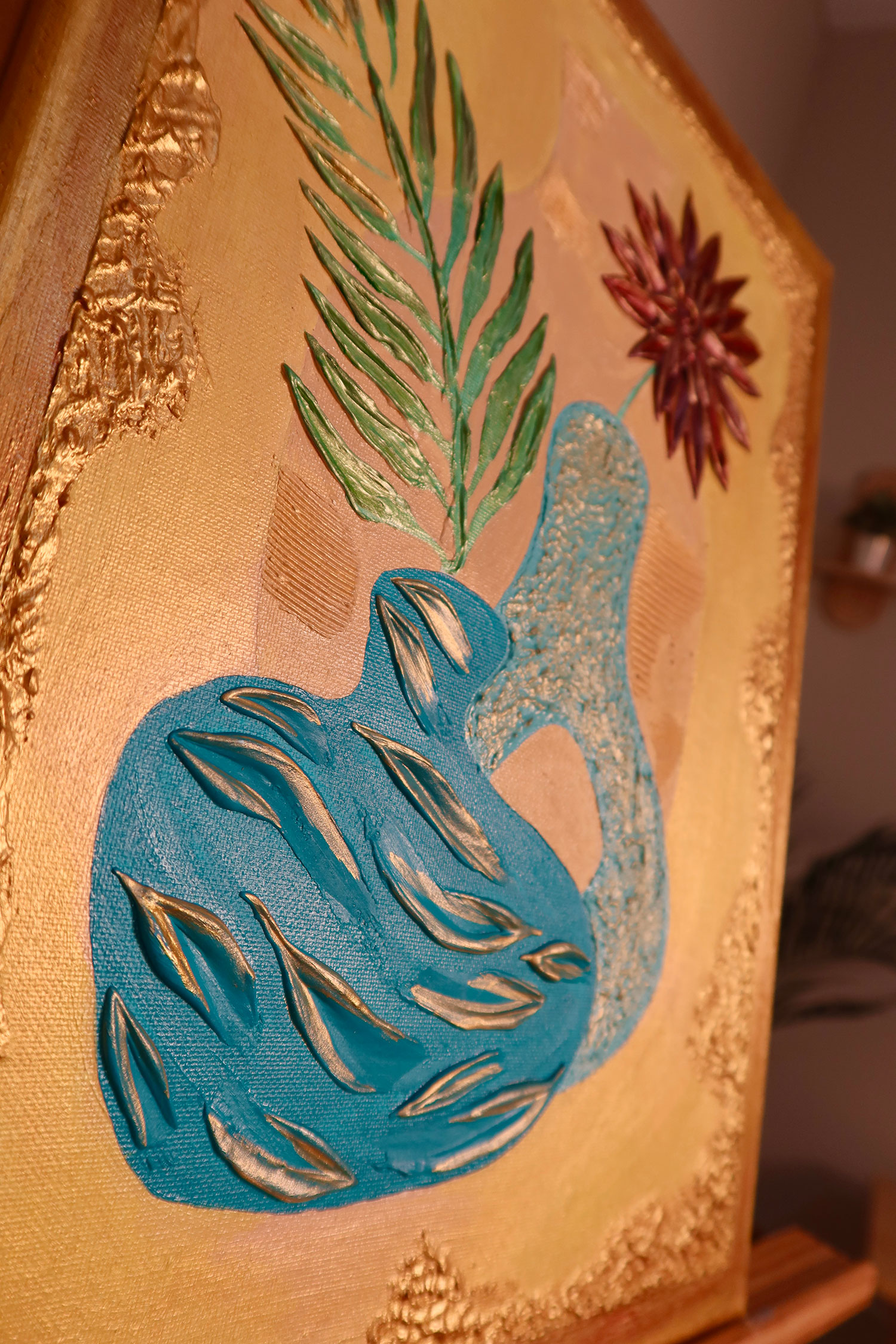 I create illustrative, minimalist and abstract works that shine with texture and depth, using acrylic paint, modeling paste and layered materials to spark feeling and reflection. Each piece flows from personal experience, becoming a reflection of God’s renewing grace and the beauty that emerges when we release what no longer serves us. In harmony with Shedding // Becoming, my art embodies the promise of Scripture: “that when we let go of the old, God makes all things new.“ Visitors are invited to step into a space of hope, transformation, emergence and the radiant unfolding of faith.