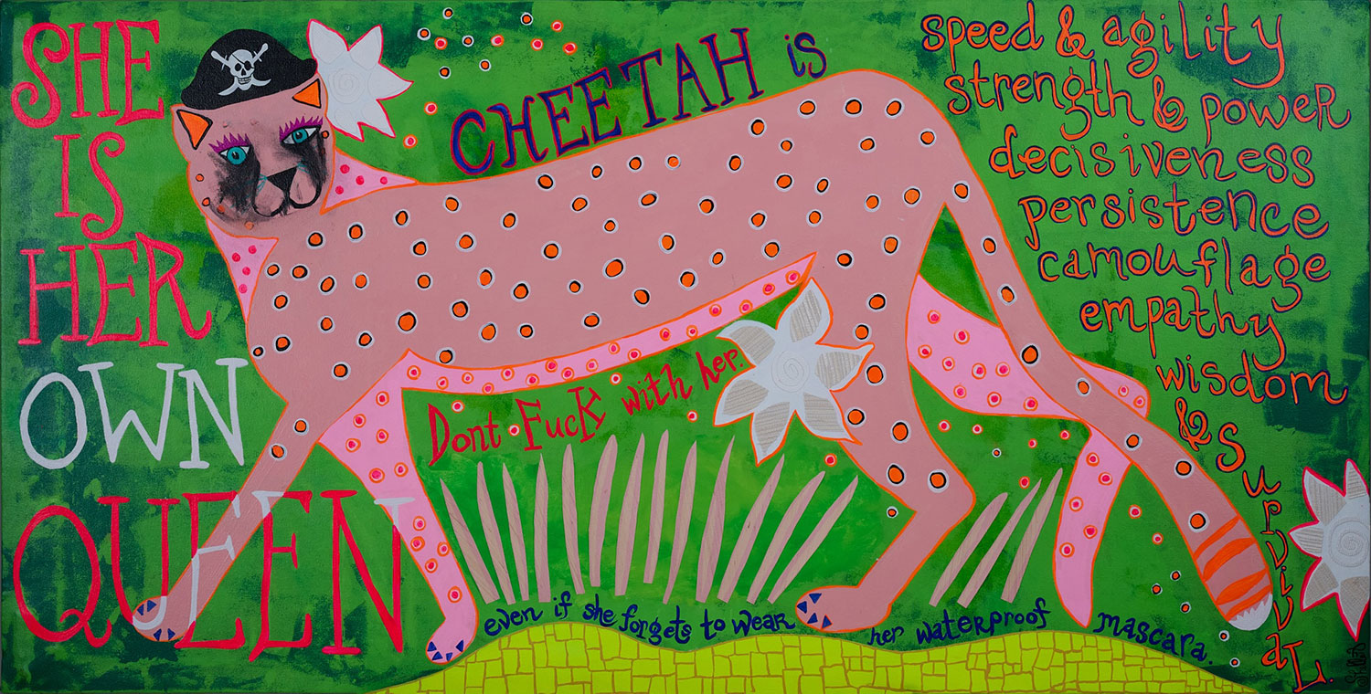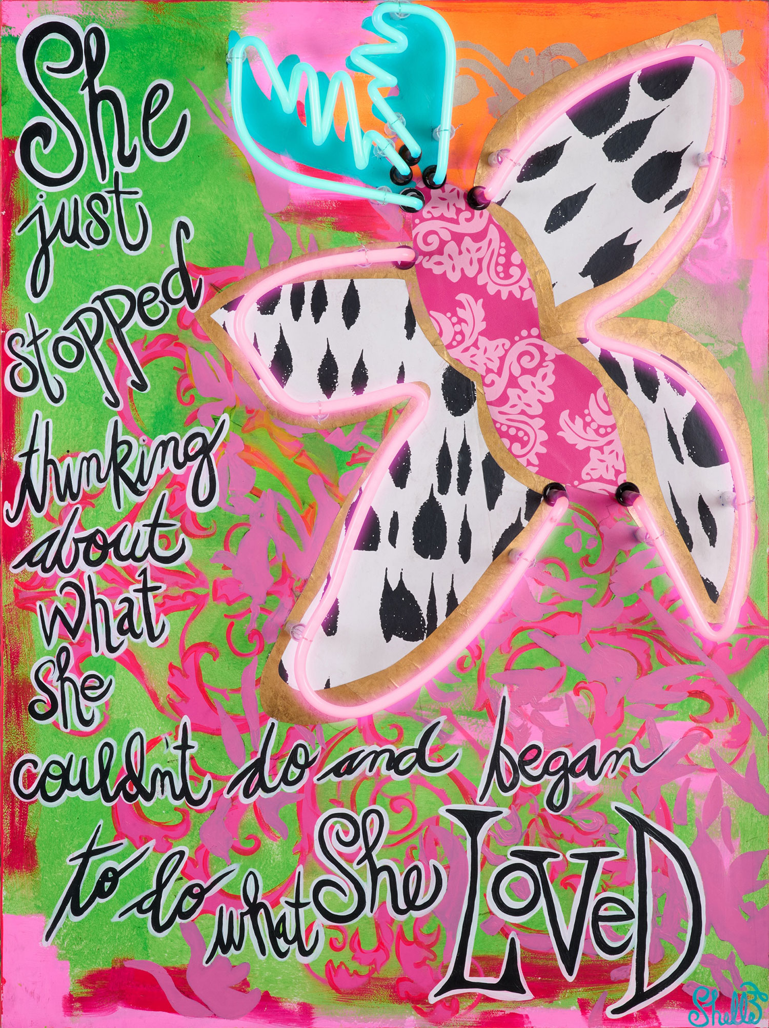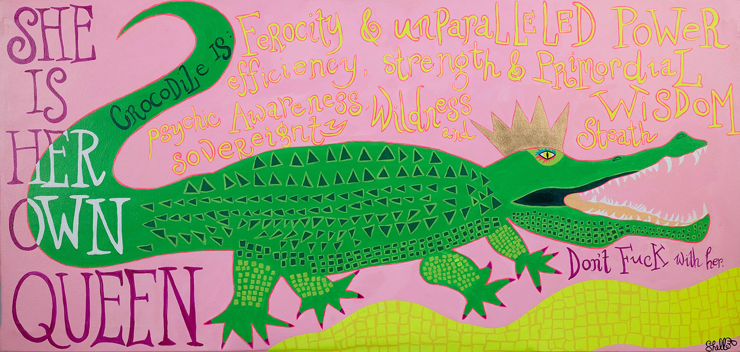 Expect a fun, colorful and vibrant home studio when you walk through Shelley’s door. From vintage wallpaper to pink chandeliers, Shelley’s truly created a self-love journey that almost emulates Alice in Wonderland. Shelley’s spotlight pieces include her large scale Animal Queen paintings, mixed media neon and hand-painted signs. Expect bubbly positivity when you arrive!