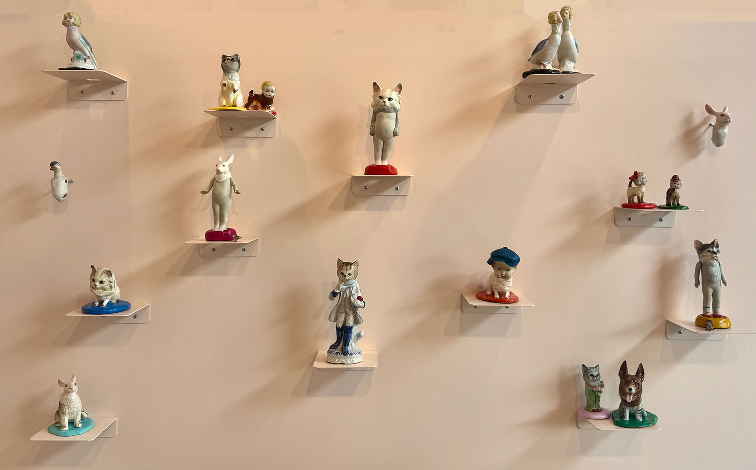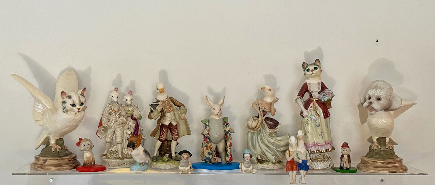 “Life is pretty much just an estate sale waiting to happen,” is a phrase I use when discussing the origins of my work. My whimsical chimera sculptures are amalgamations of found ceramic dolls and animal figurines. I imagine them spending decades in their original form as truly beloved objects then ending up in a two-dollar bin. I rescue, re-contextualize, and ultimately anthropomorphize these creations. Using supplemental colors and handmade sculptural addenda, I infuse discarded keepsakes with giddy esteem and transforms them into original works of art.