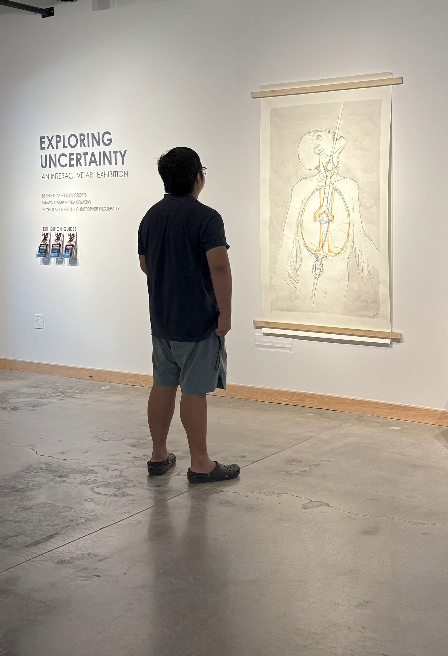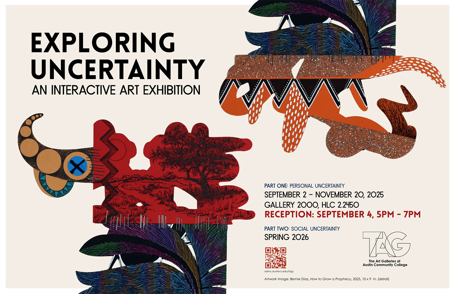 Developed in tandem with ACC Faculty, Exploring Uncertainty is an interactive art exhibition, featuring artworks by ACC Studio Art faculty shown alongside works by students, alumni and Austin-based artists. Participating artists include Shawn Camp, Ellen Crofts, Nicolas Dertien, Bernie Diaz, Christopher Fitzgerald and Ezra Romero. Thematic interactive stations are included to provide creative and generative spaces for gallery visitors to explore the theme of uncertainty through collaborative visual experiences and shared artistic expression.