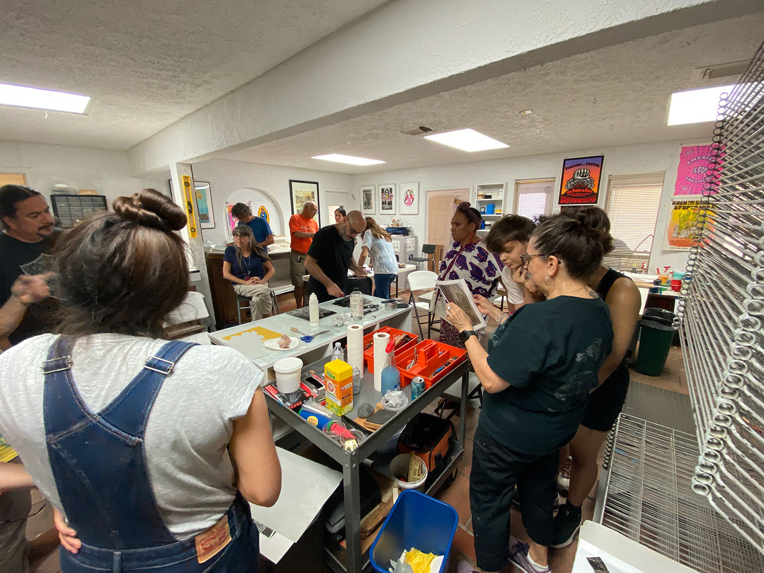 Originally founded in 2006 by Dominican artist Pepe Coronado, Coronado printstudio was established in various locations, such as Washington D.C. and El Barrio, New York before relocating to Austin in 2019. Rooted in the philosophy that printing is a collaborative medium, we believe that voices and stories are most powerful when seen and heard collectively. Our studio functions as an open and inclusive space for these discussions and innovative collaborations to manifest. Visitors can explore our vast collection of works by Latino, Chicano, Afro-Latino, Caribbean and Diaspora communities.